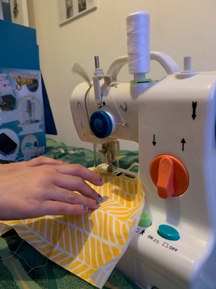 Et puis comment ne pas se prendre au jeu quand on a un matériel digne de professionnels? En effet, en plus de la machine, la boîte comprend un mètre ruban pour mesurer le tissu et prendre les mesures de la personne à qui est destiné le modèle, des ciseaux bleus pour découper les tissus, les fils et les patrons, des ciseaux jaunes pour découper en zigzag, des canettes en métal, deux bobines de fil, une boîte d’épingles pour fixer le patron sur le tissu, une aiguille pour coudre les boutons par exemple, trois aiguilles pour la machine, un enfile aiguille et des patrons qui servent de guide pour découper les tissus. Bref, il ne manque vraiment rien.