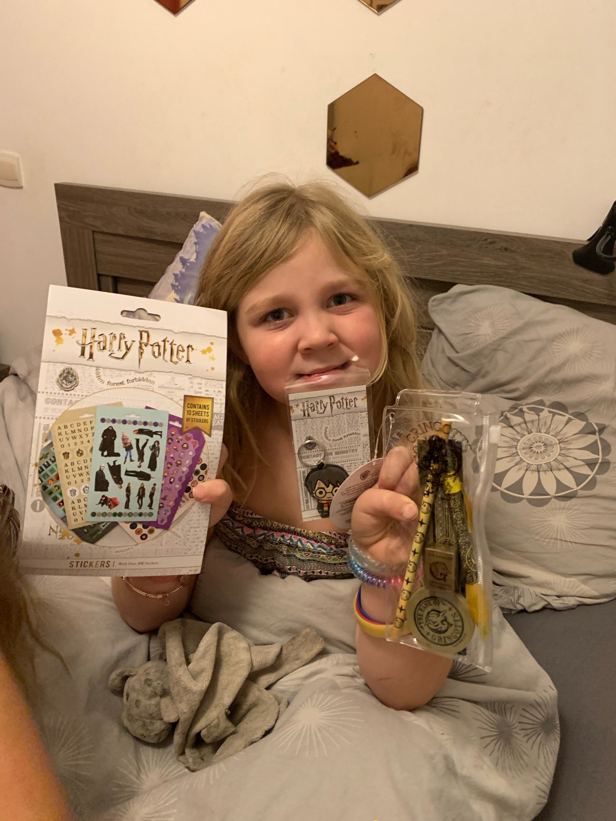 Pour Camille, ce fut sans surprise le pin’s Harry Potter (qui existe aussi en version Hedwige ou voie 9 3/4) pour le fixer sur sa tenue d’Hermione et le sachet de bonbons en vraie gourmande qui se respecte! Anaïs, elle, a obtenu le porte-clé Harry Potter (qui existe en plusieurs modèles) pour le mettre sur son cartable et le set de papeterie (un crayon, une règle, un stylo, une gomme et un taille-crayons) pour « encore mieux travailler à l’école » comme elle dit.