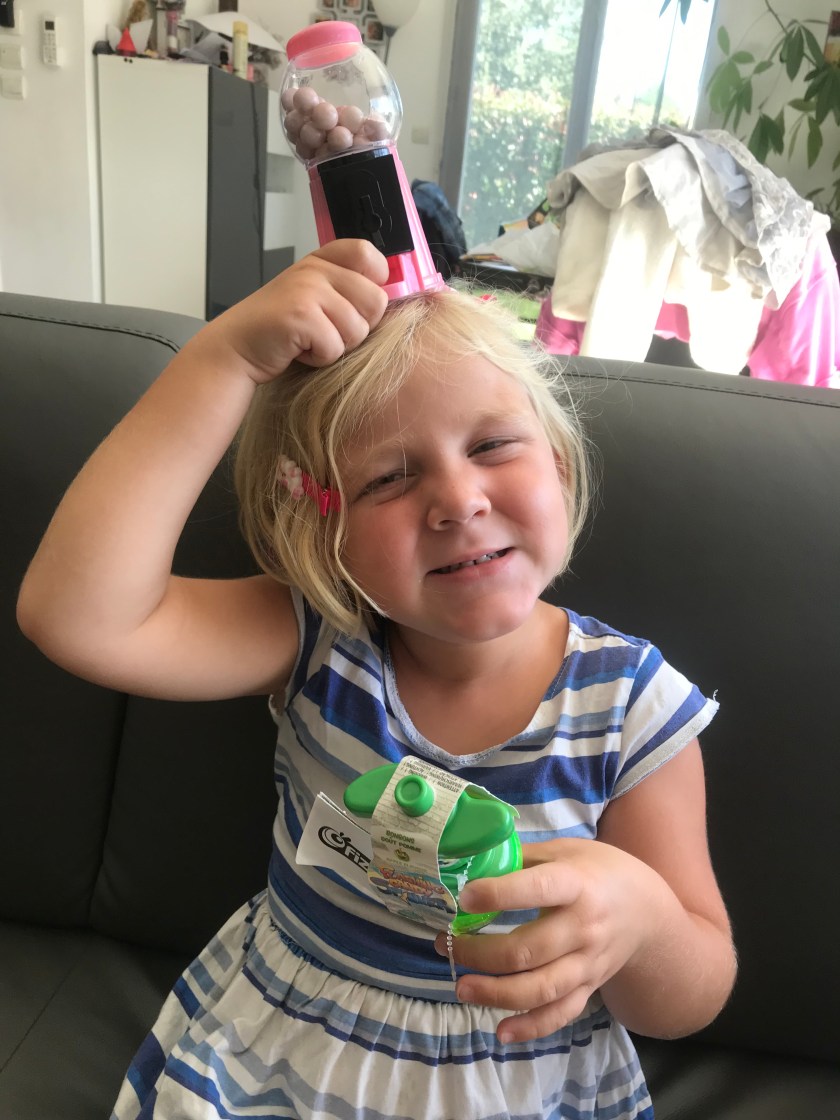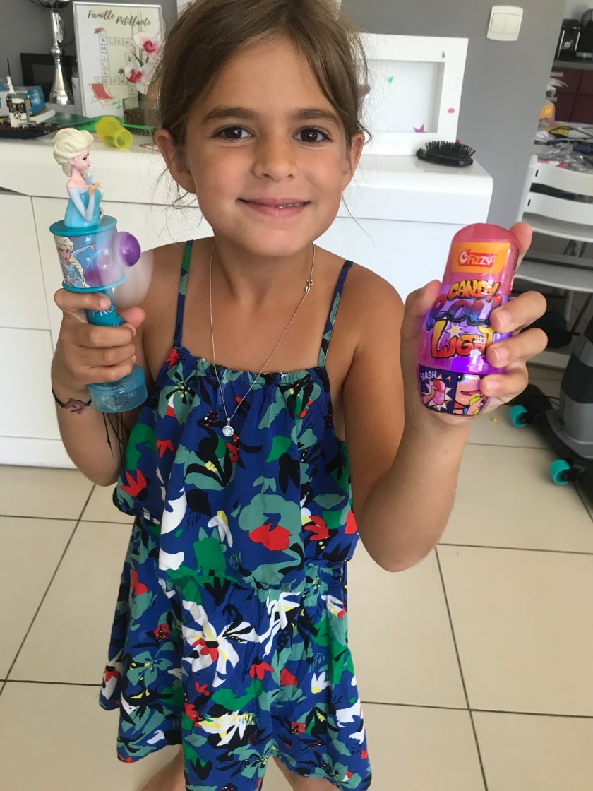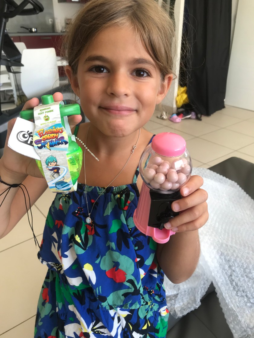 Revenons-en à présent au colis que nous avons eu la chance de recevoir et que vous avez pu commencer à découvrir en images depuis le début de l’article. Je commence par le gros coup de cœur de Camille qui en rêvait depuis un bon moment maintenant: le distributeur de billes de Bubble Gum. Le modèle que nous avons reçu est rempli de chewing-gums à la fraise (un des parfums préférés de Maël et Camille, ça tombe bien!) et en prime le distributeur est rose, comble du bonheur pour elle! Je vous garantis que Maël doit jouer des coudes pour s’en approcher du coup! Ce produit existe aussi en bleu avec des chewing-gums à la framboise et en vert avec des chewing-gums à la pomme. Je ne le dis pas trop fort, sinon les loulous les voudront tous!