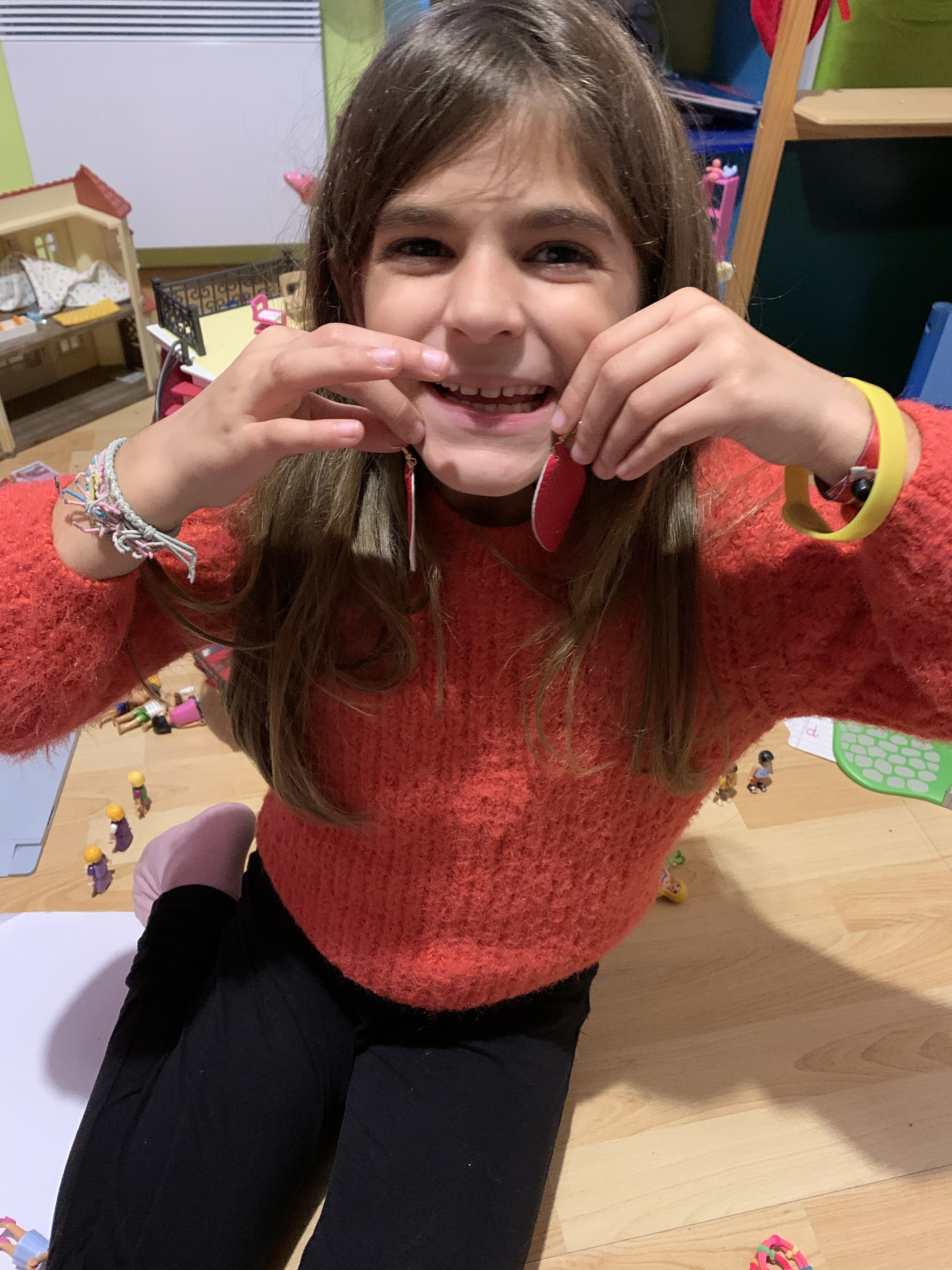 Son second coup de cœur est pour le petit taxi en bois (d’autres modèles sont disponibles sur le site: le camion de pompier, le Bus de tourisme et le bus scolaire), elle le trouve “trop joli” comme elle dit et adore y mettre ses petites figurines pour Les emmener en voyage! Et puis en prime, il est accompagné d’un sachet de 75g composé de plusieurs bouchées au chocolat au lait aux céréales (ne lui dites rien mais je lui en ai volé un et ils sont juste délicieux!).