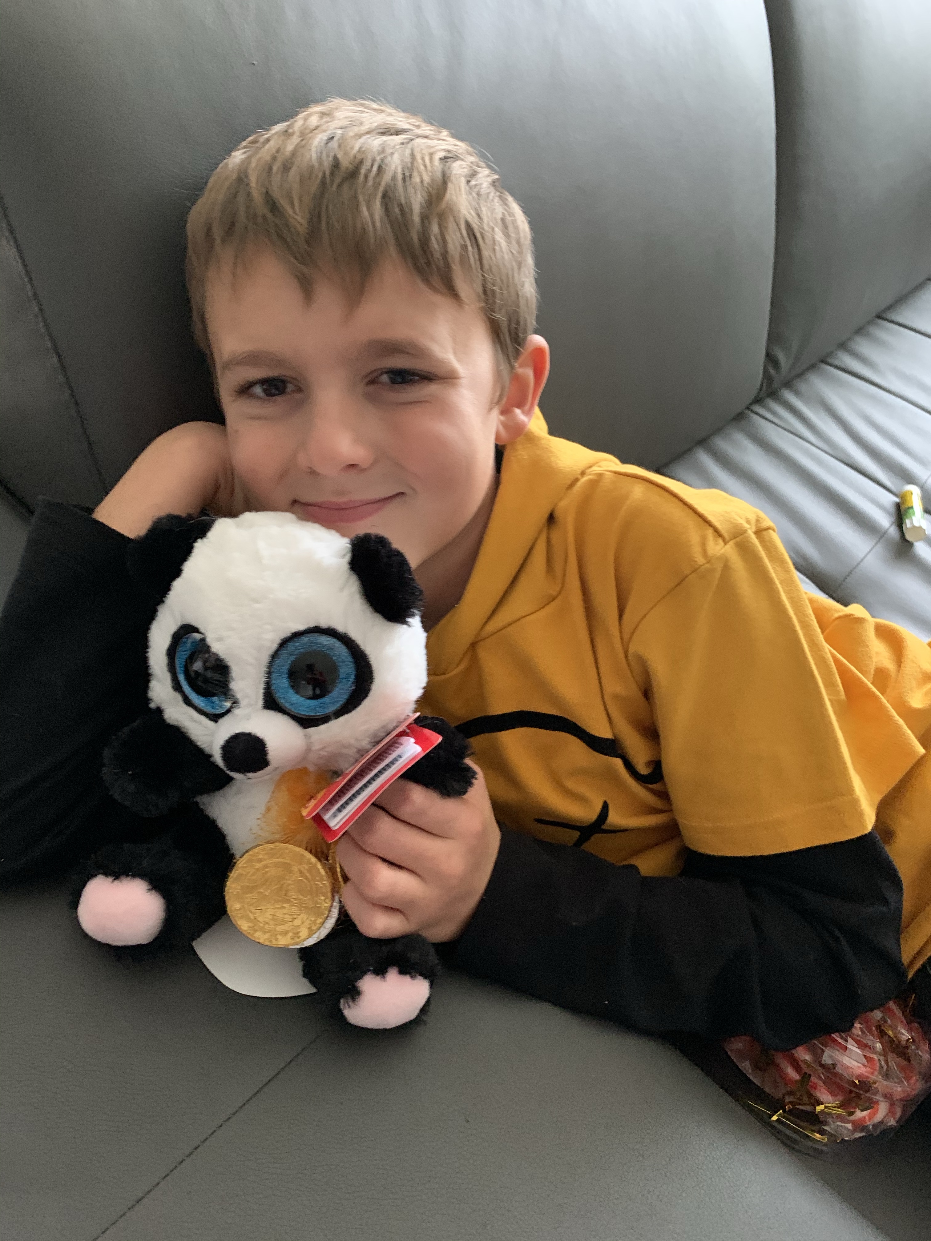 Commençons à présent la découverte du colis avec le gros coup de cœur de Maël, l’amoureux de la nature et des animaux, et cet adorable panda. Je ne sais pas vous, mais moi ses yeux me font littéralement fondre et il est tellement doux qu’on a une seule envie: lui faire des câlins (et je vous garantis que depuis qu’on l’a reçu ils n’en manquent pas puisque les trois loulous passeraient leur journée avec s’ils le pouvaient! Heureusement, comme le colis était bien garni, ils se sont malgré tout répartis les peluches et organisent des tours de garde de temps à autre.