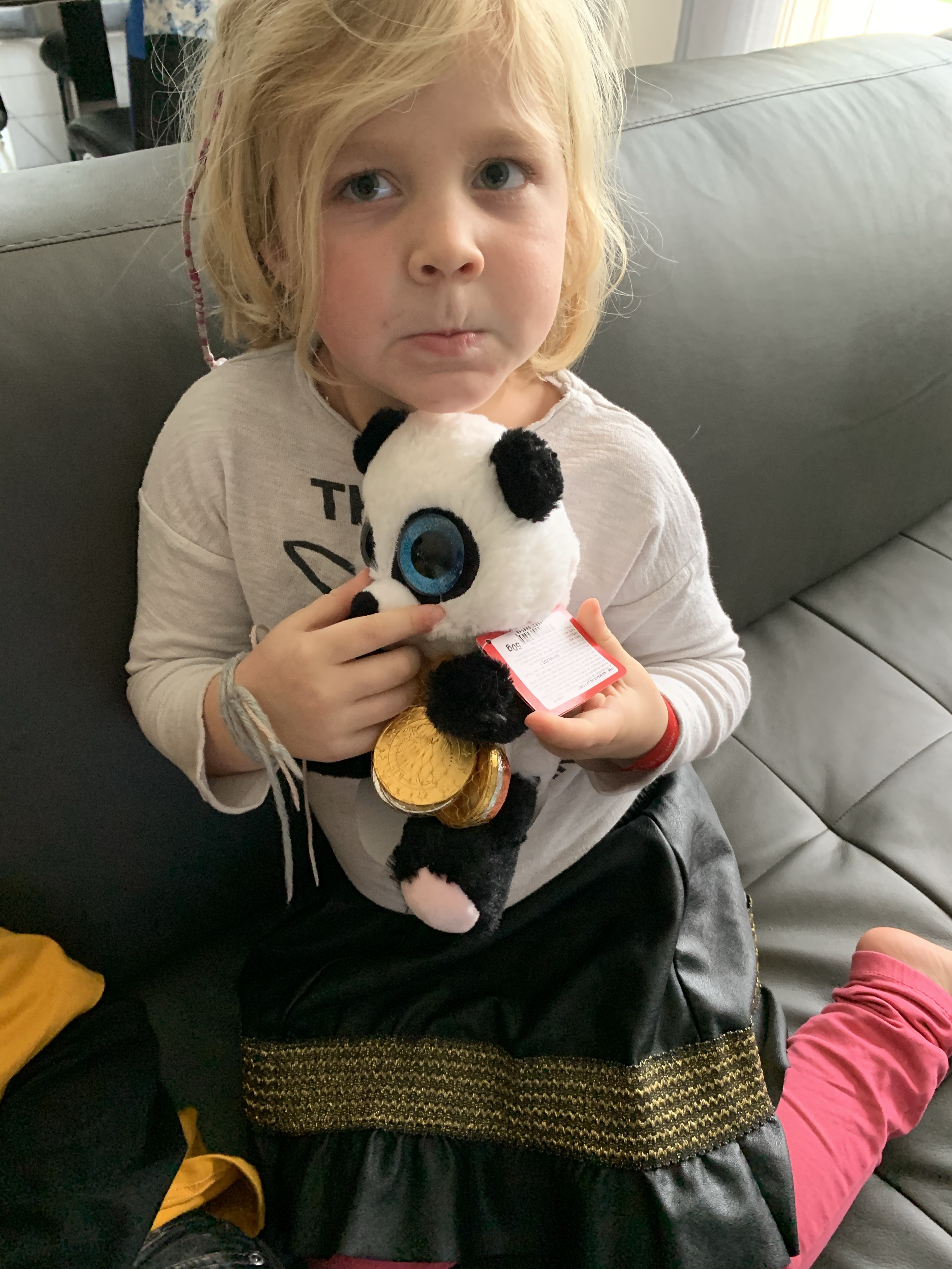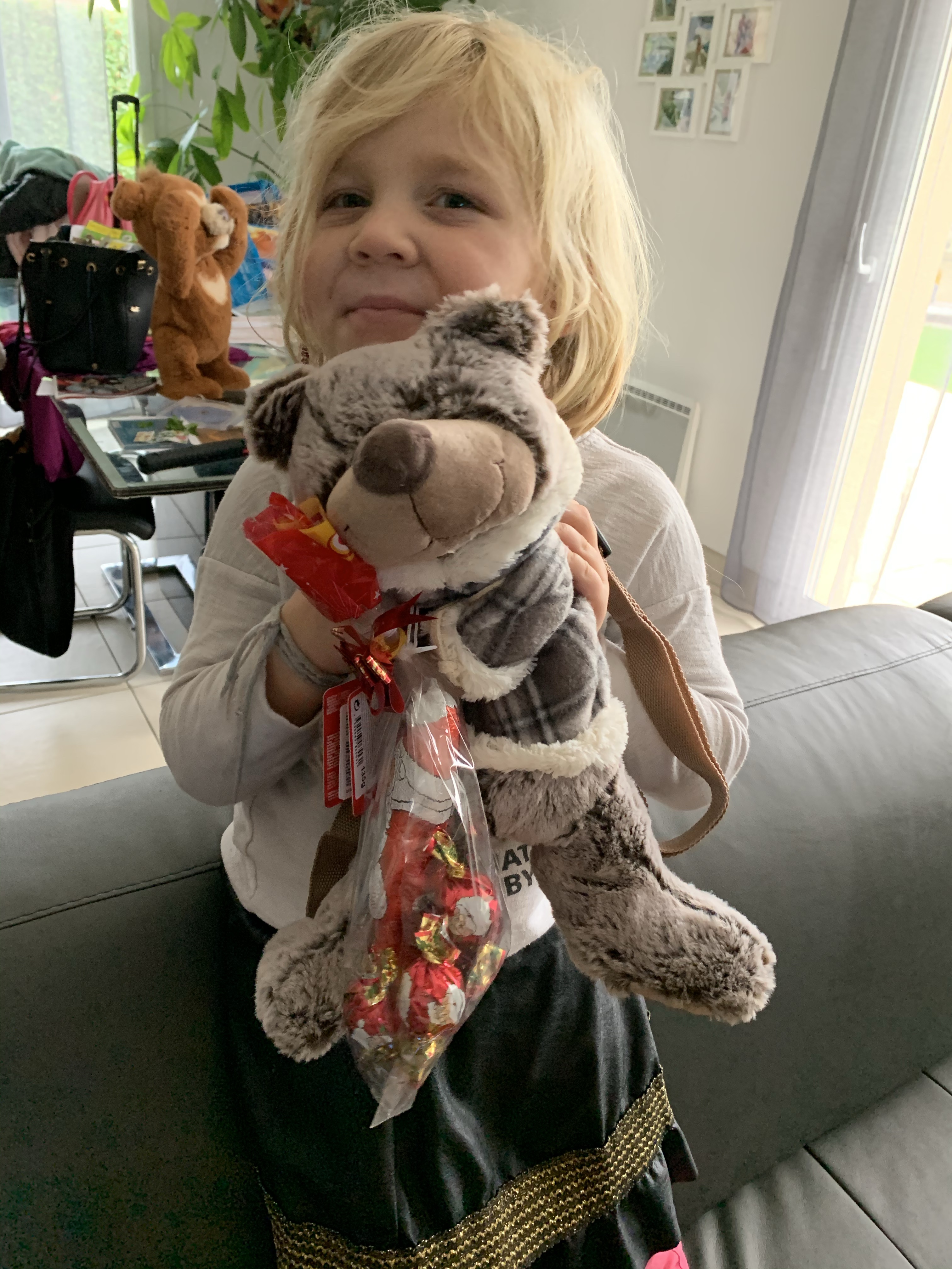 Et la peluche panda de Noël est arrivée accompagnée de pièces de monnaie en chocolat UTZ qui n’ont pas fait long feu car c’est le péché mignon de ma petite Anaïs! Vous pourrez aussi trouver dans le commerce des peluches renard et chouette tout aussi douces et adorables (mais chut, ne le dites pas aux loulous, ils risqueraient me les réclamer sinon, lol!).