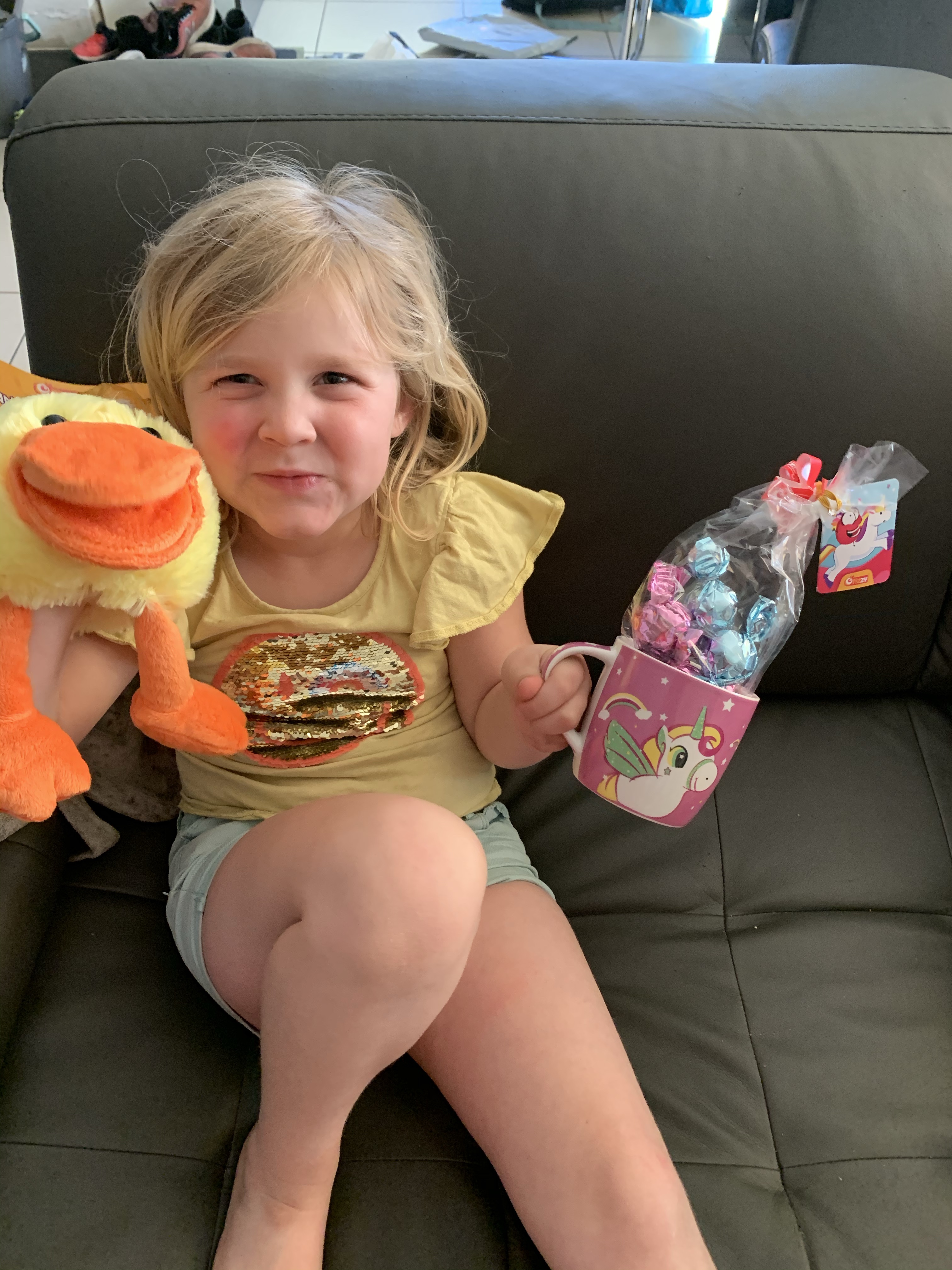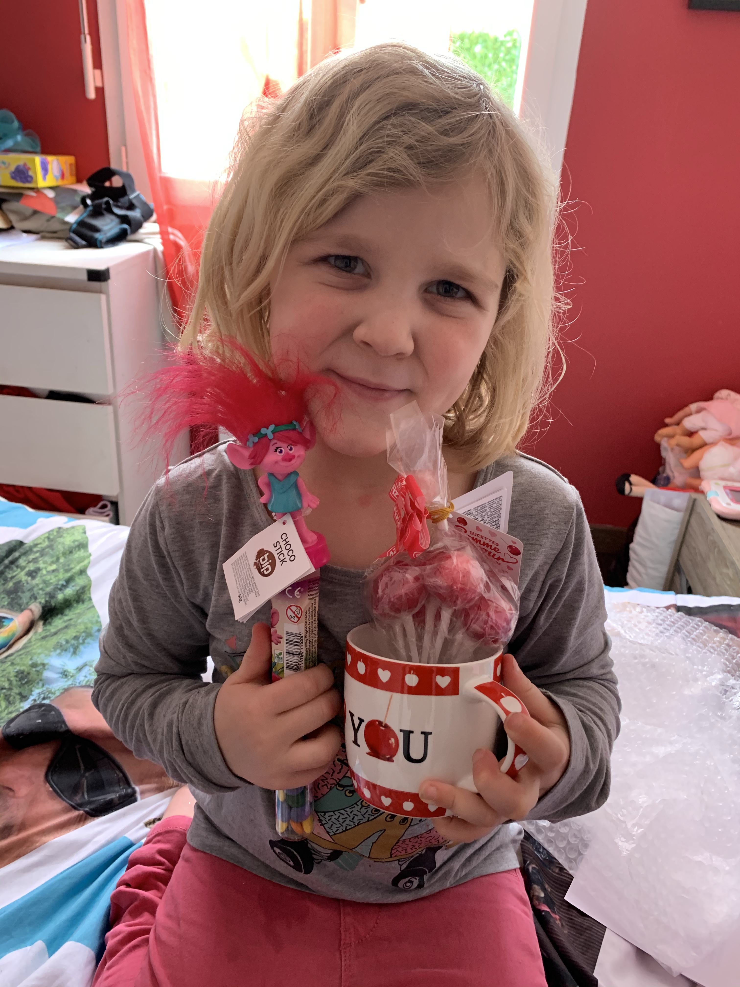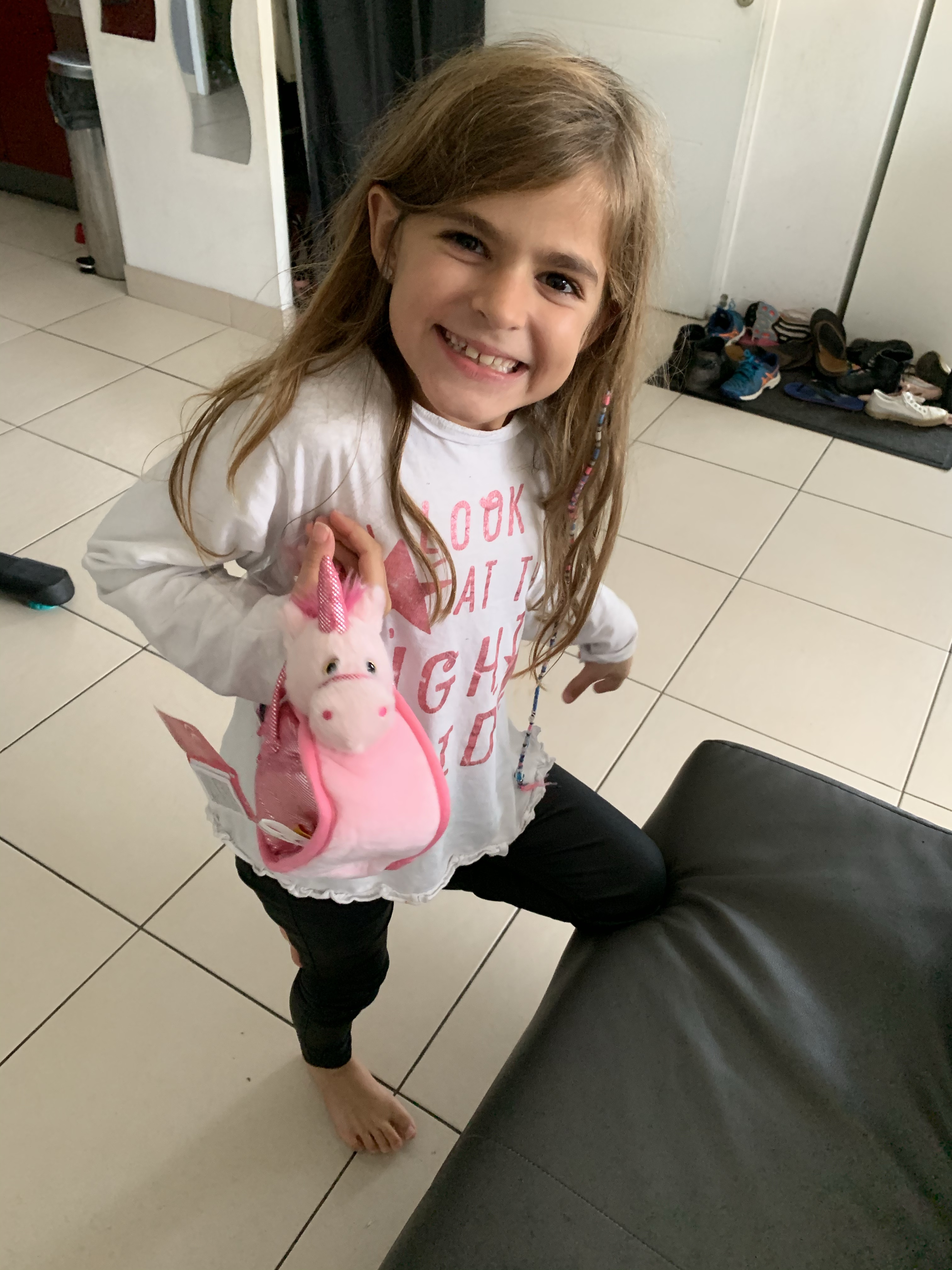 On enchaîne avec le produit favori de Camillou (même si elle a longuement hésité) avec le sac à main licorne trop stylé et idéal pour la petite fan coquette! La peluche existe en rose et en blanc et les puces ont eu la chance de la recevoir en rose, leur couleur préférée (avec le violet!). Et bien sûr, elles ne sont pas arrivées sans quelques friandises: des bouchées chocolat céréales (chocolat UTZ et crème RSPO) dont papa surmené n’a fait qu’une bouchée justement, mdr! Et une fois vidée, le sac à bien entendu trouvé une seconde vie puisque la puce y met ses affaires quand on va faire les courses ou que l’on a un trajet assez long à faire en voiture. Je pense que son sourire radieux en dira plus que des mots de toutes façons!