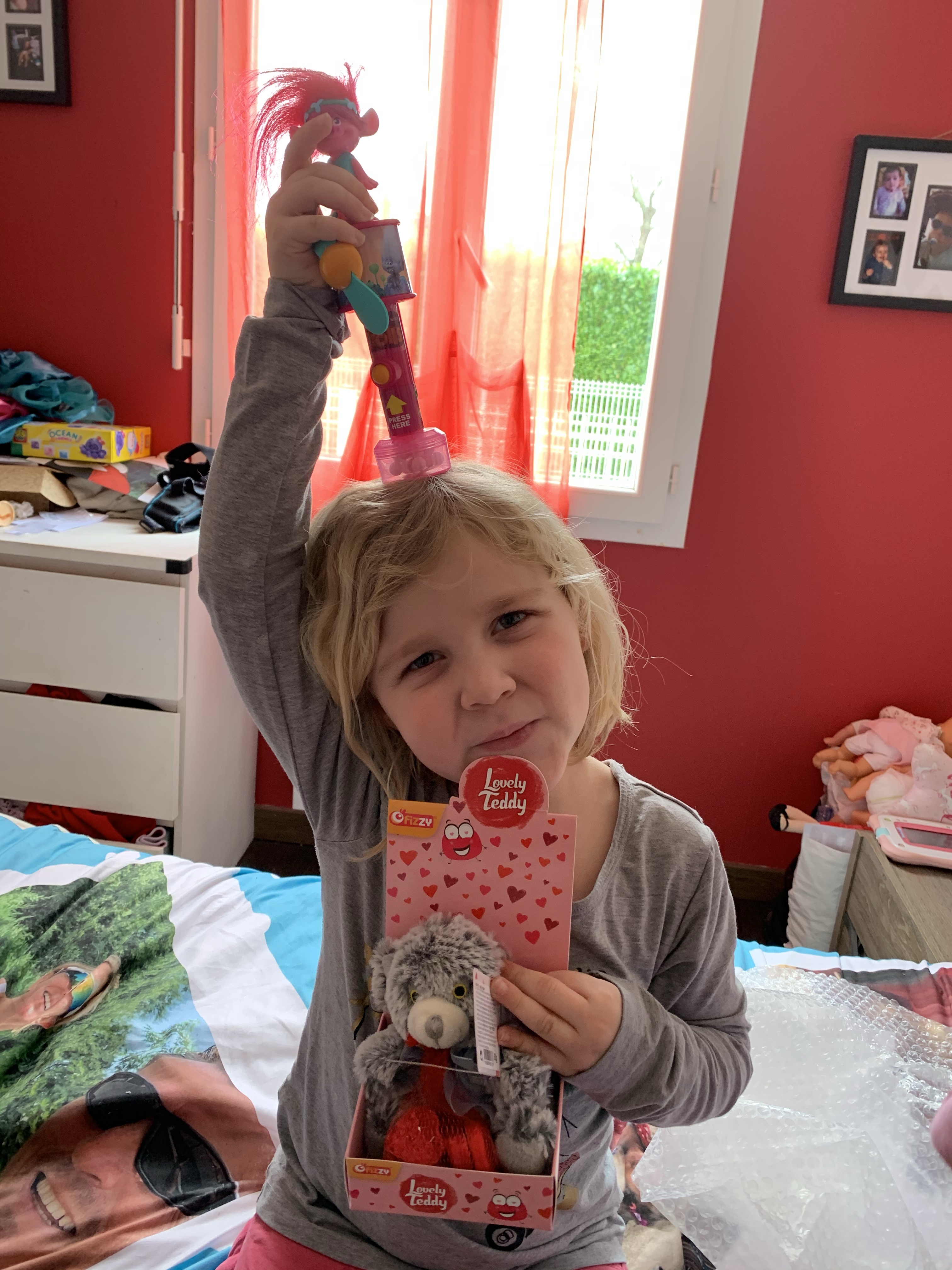 Je pense qu’il est à présent temps de vous parler plus précisément du contenu du colis que vous avez pu commencer à découvrir en images depuis le début de l’article. On va commencer avec ce qui a vraiment fait l’unanimité chez les trois loulous: les peluches! Toutes plus chou les unes que les autres! Du coup, ils se les partagent et elles changent régulièrement de propriétaire pour ne pas faire de jaloux! On peut constater à la tête d’Anaïs et à la façon dont elle les serre contre elle qu’elle les apprécie vraiment!