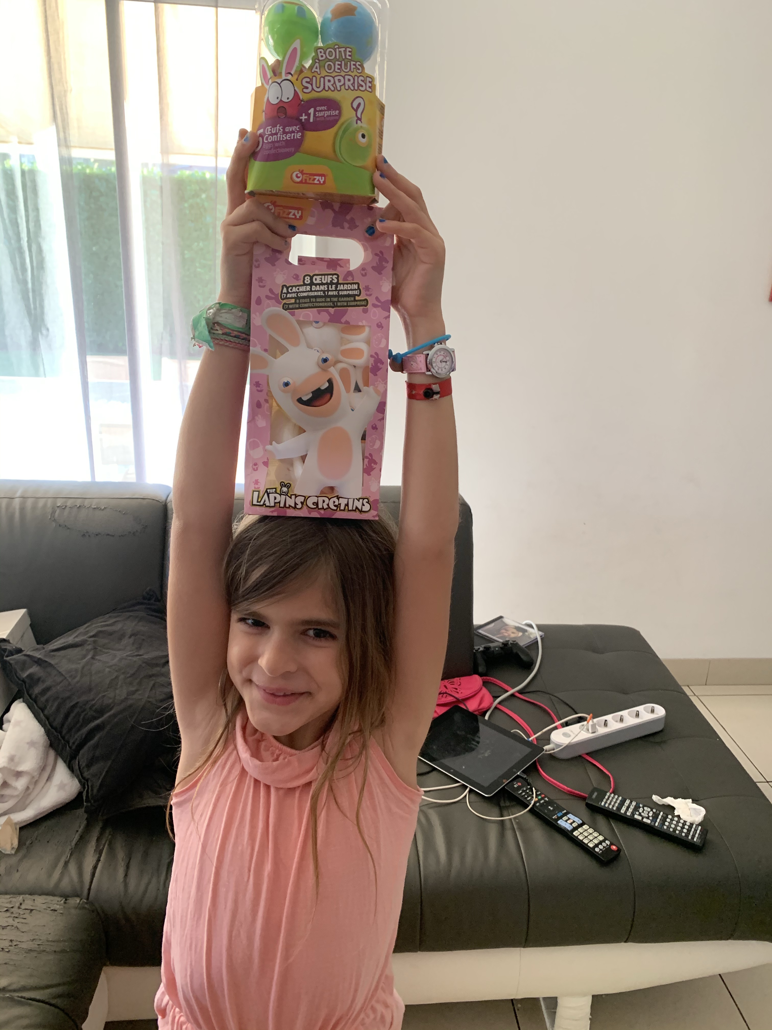 Un autre produit qui attend bien sagement dimanche dans le placard est la boîte à œufs surprises qui intrigue grandement les enfants… Elle se compose de six adorables œufs colorés et décorés , cinq d’entre eux sont remplis de bonbons et le dernier est garni d’une surprise. Mais laquelle? Réponse après la chasse de dimanche s’ils réussissent à tout trouver!