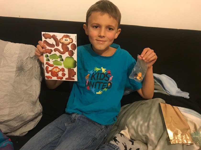 Mais ce qui lui a encore plus fait plaisir ce sont les deux cadeaux suivants car en ce moment il est à fond dans les activités artistiques et en plus sa prof de dessin leur avait demandé d’amener des rubans, des paillettes et d’autres accessoires pour leur prochain cours alors ça ne pouvait pas mieux tomber! Il était aux anges en ouvrant les petits paquets!