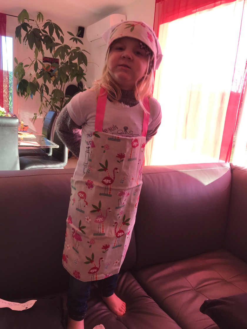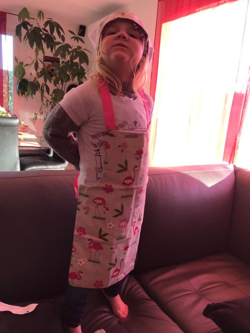 Il faut dire que je la comprends car moi aussi je le trouve magnifique et je la trouve adorable avec! Le tissu est très bien choisi et de qualité, rien n’a bougé après plusieurs semaines d’utilisation. La pointe de rose sur les bretelles notamment est un gros plus pour ma petite princesse. Et puis l’idée de la toque assortie est géniale car ça plait forcément aux enfants et je trouve que cela leur permet d’encore plus se prendre pour un chef! Un autre point positif est que l’envoi est rapide et soigné tout comme le travail de couture.