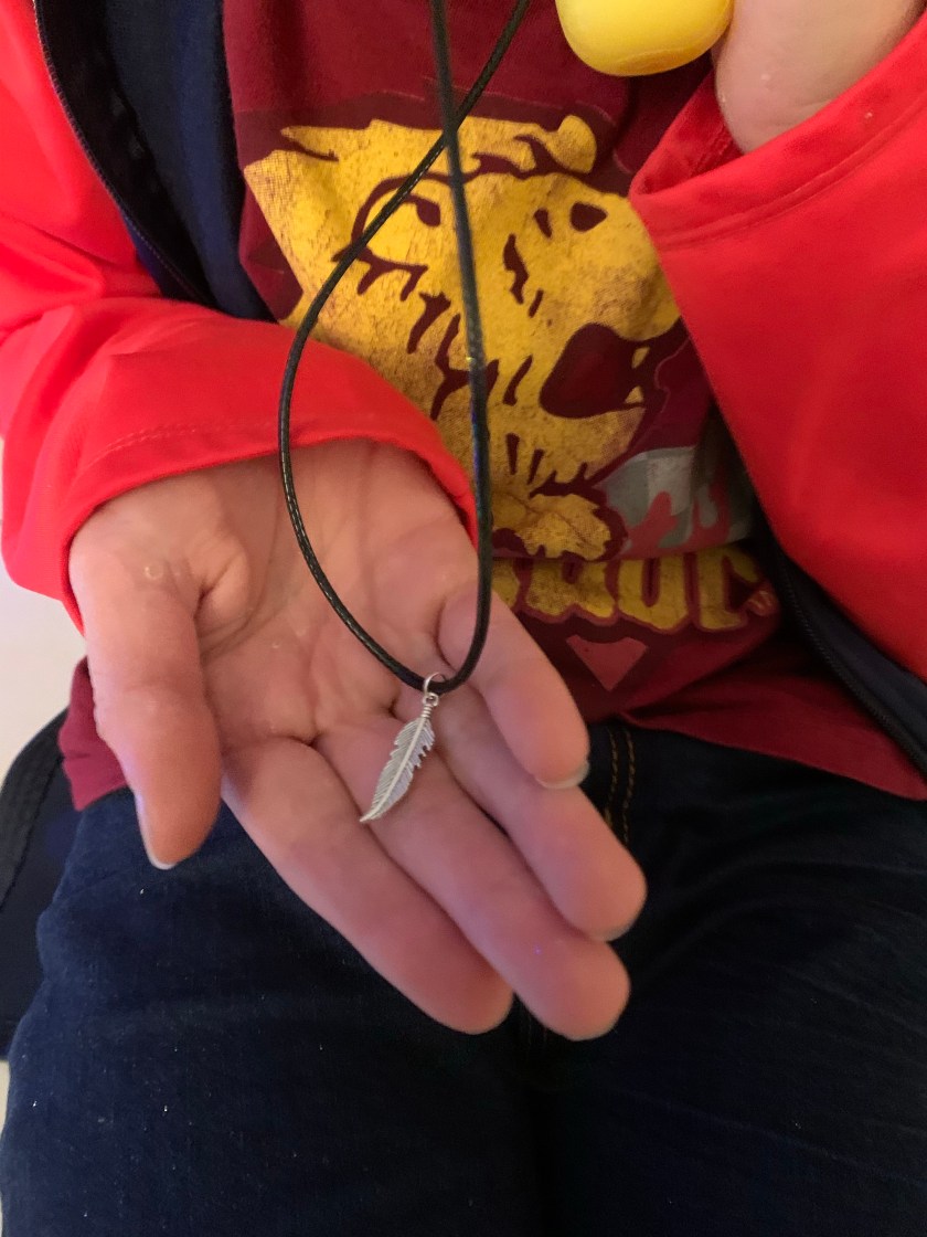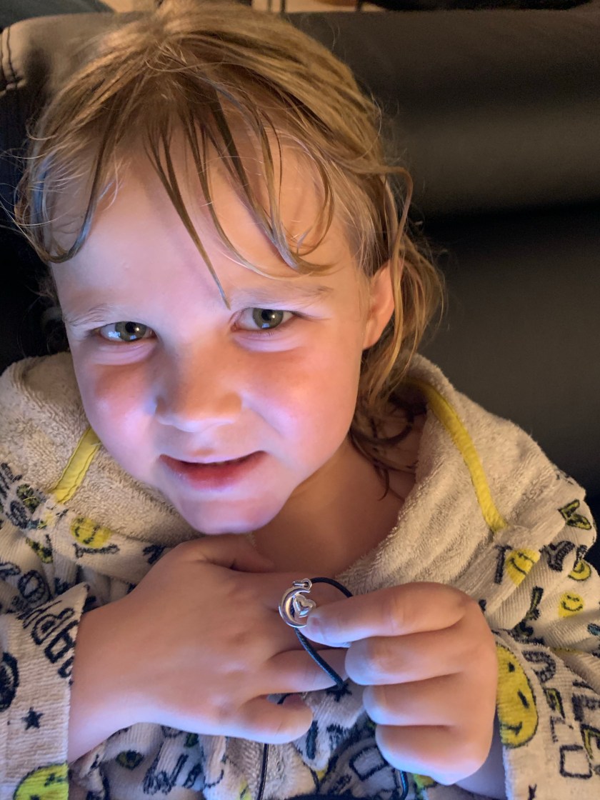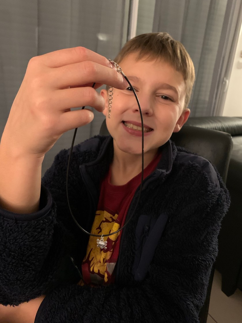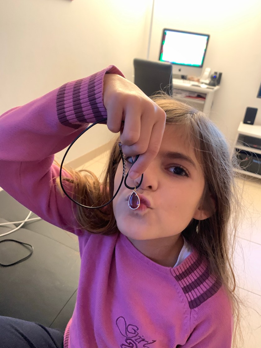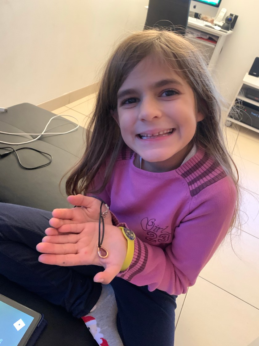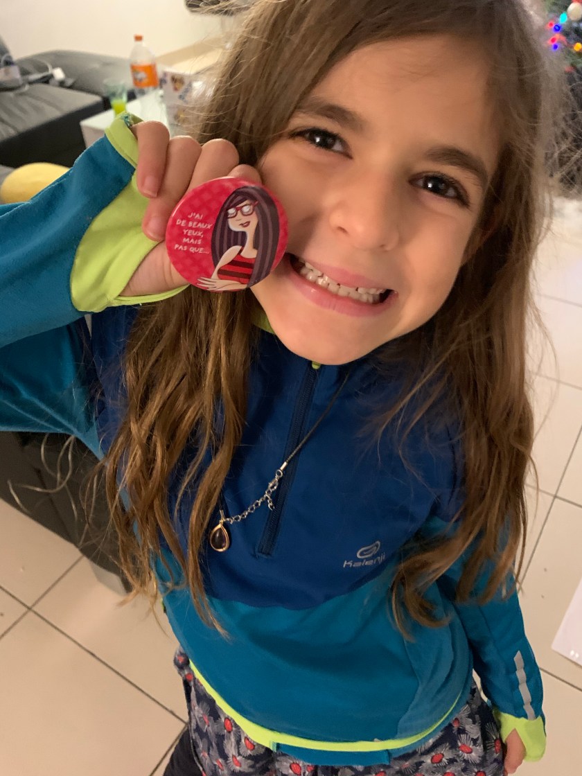 Mercredi, elle a découvert un magnifique collier avec un A majuscule argenté, l’initiale de son prénom donc, et elle est totalement tombée sous le charme! Ses copines ont été un peu jalouses d’ailleurs… Jeudi et vendredi, ce sont deux jolis badges qui sont venus s’ajouter à sa boîte à bijoux…