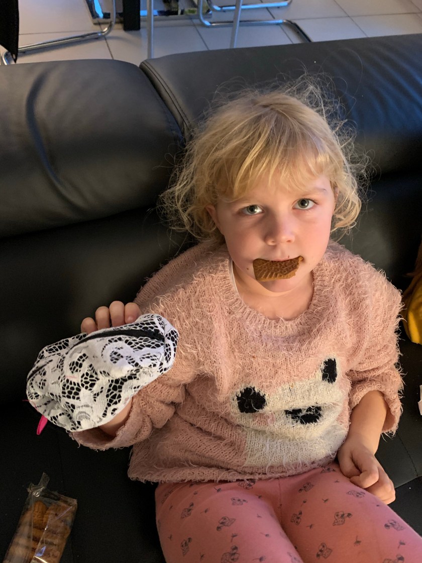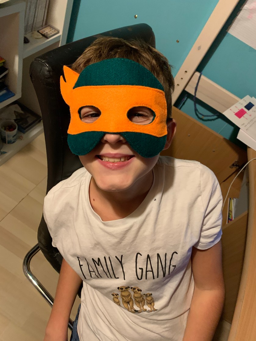 On entre plus vivement dans le thème Halloween de ce mois d’octobre avec l’incontournable serre-tête citrouille qui ornait fièrement sa tête le soir de la récolte de bonbons et le joli élastique aux couleurs du thème qu’elle porte encore très souvent car elle l’apprécie beaucoup.