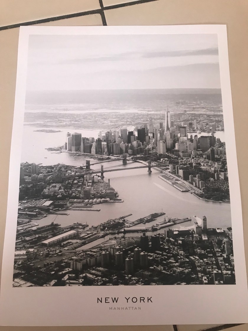 Privilège de l’âge oblige, il a eu droit à un second choix (avec mon aval car je trouve qu’il a très bon goût, ben oui il m’a choisie mine de rien, mdr!!) et en fan de New York, ville qu’il rêve de visiter, il a forcément craqué pour ce poster! Il s’agit d’une vue aérienne de Manhattan, la qualité du papier et de l’encre sont identiques à celle du précédent et celui-ci est vendu au prix de 11€21. Je ne sais pas vous mais moi j’adore les photos en noir et blanc, je trouve que ça met encore plus en valeur le paysage.