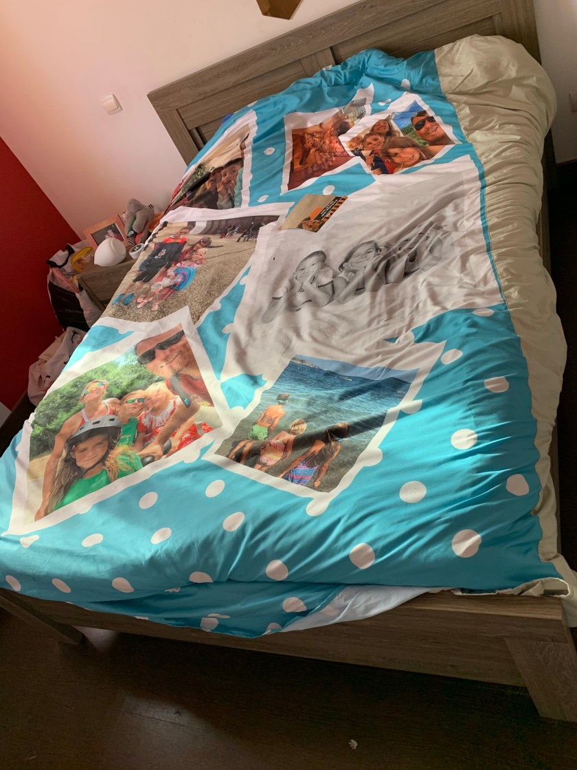 En ce qui me concerne, je n’ai rien eu à critiquer tellement j’adore ma housse! Je trouve la qualité de l’impression parfaite, les photos rendent vraiment bien et le tissu est épais, doux et confortable, on sent directement la qualité (pas comme certaines housses que l’on peut acheter parfois et qui sont aussi fines que du papier à cigarette…). Et je ne suis pas la seule à l’adorer, toute la famille est conquises (les loulous sont ravis d’être imprimés sur notre lit comme ils disent) et tous les amis qui ont eu l’occasion de la voir m’ont demandé où je l’avais trouvée. Il n’y a donc rien à redire, on est fans et on valide!