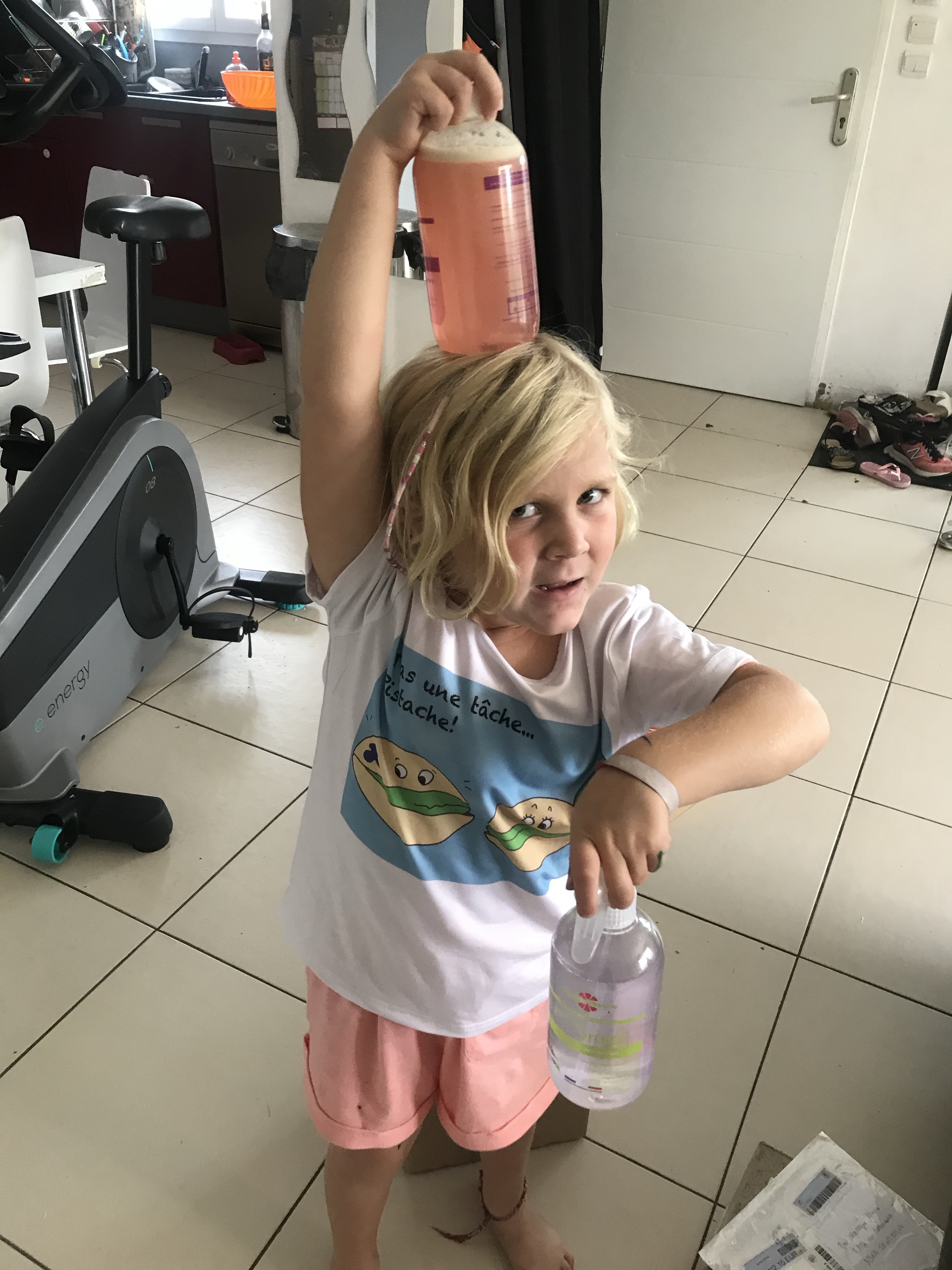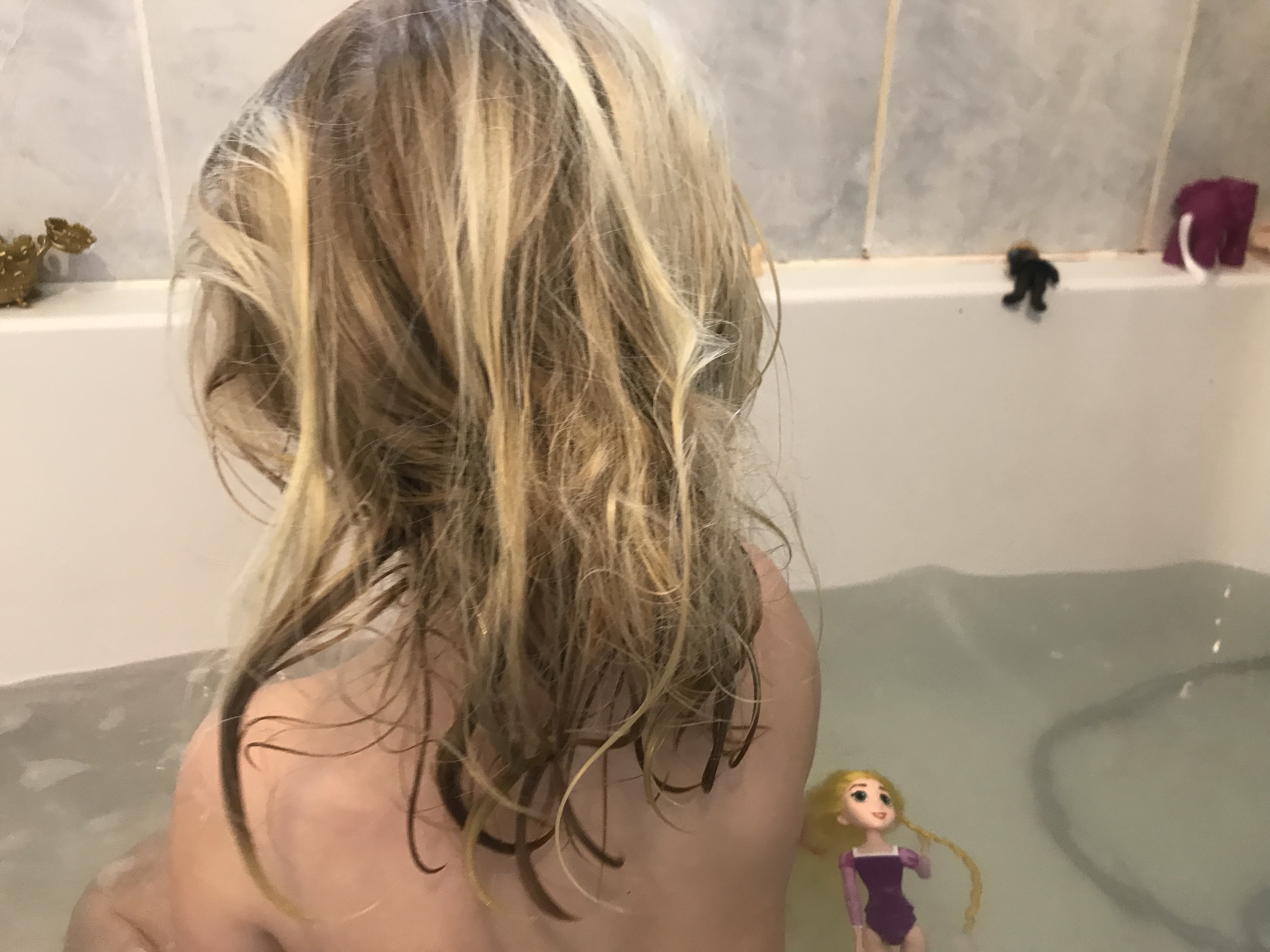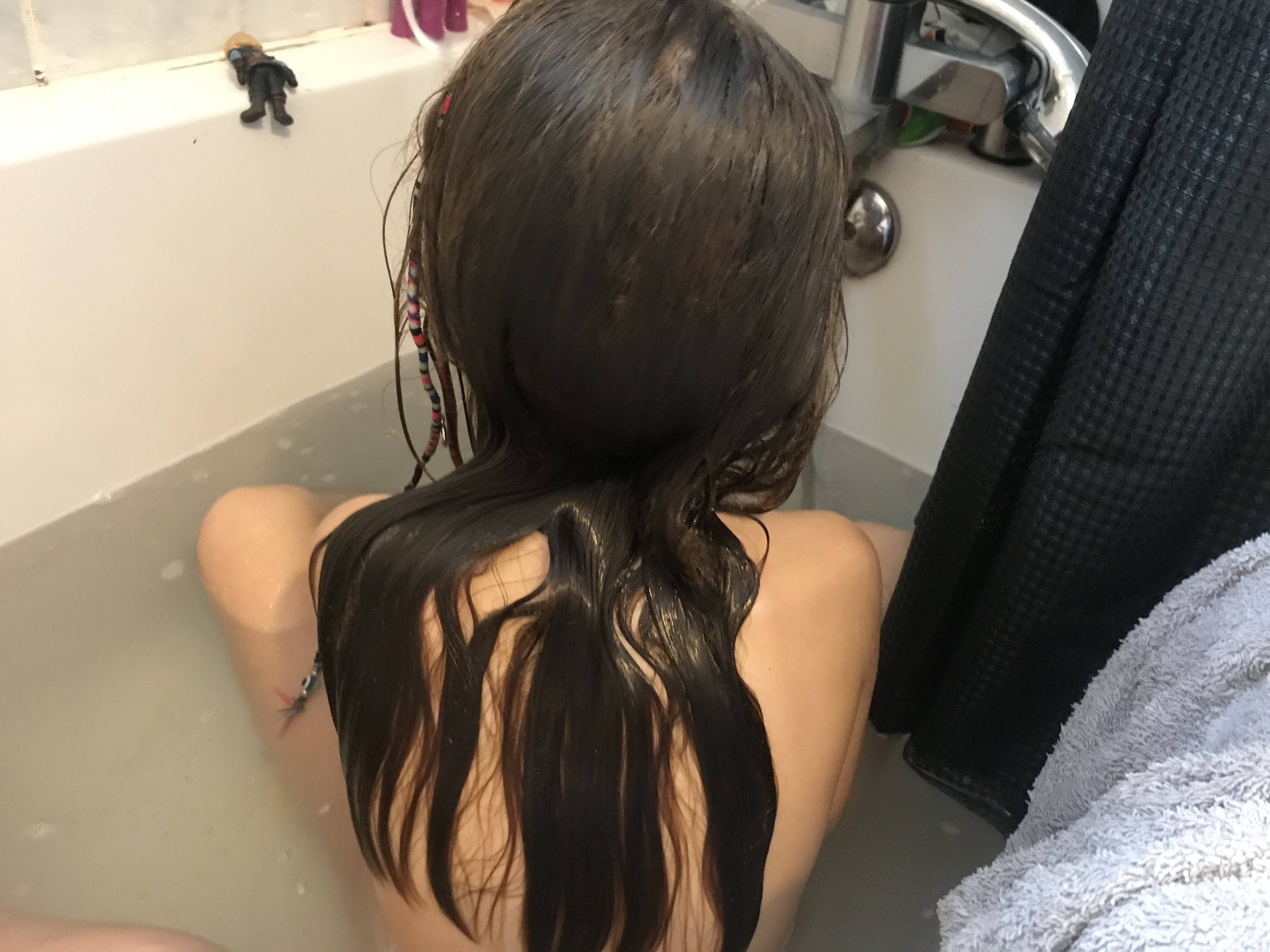 Alors maintenant place à nos impressions plus personnelles après tous ces détails théoriques et parfois un peu abstraits surtout pour les novices comme je le suis! Alors comme vous le voyez depuis le début de l’article, je l’utilise pour moi mais aussi pour les filles pour qui il y a souvent du boulot! Et oui, elles veulent les cheveux longs mais c’est une vraie galère pour les coiffer chaque matin. Premier avantage avec cet après-shampoing, sa présentation en flacon pompe très pratique pour l’application et pour éviter le gaspillage. Le produit se présente sous une forme crémeuse assez épaisse qu’il est très facile de faire pénétrer dans les cheveux. Une fois appliqué je le laisse agir entre 2 et 5 minutes et pour les filles j’utilise un peigne pour démêler en même temps, comme ça c’est beaucoup moins douloureux pour elles et ça les aide à patienter en plus. Puis on passe au rinçage.