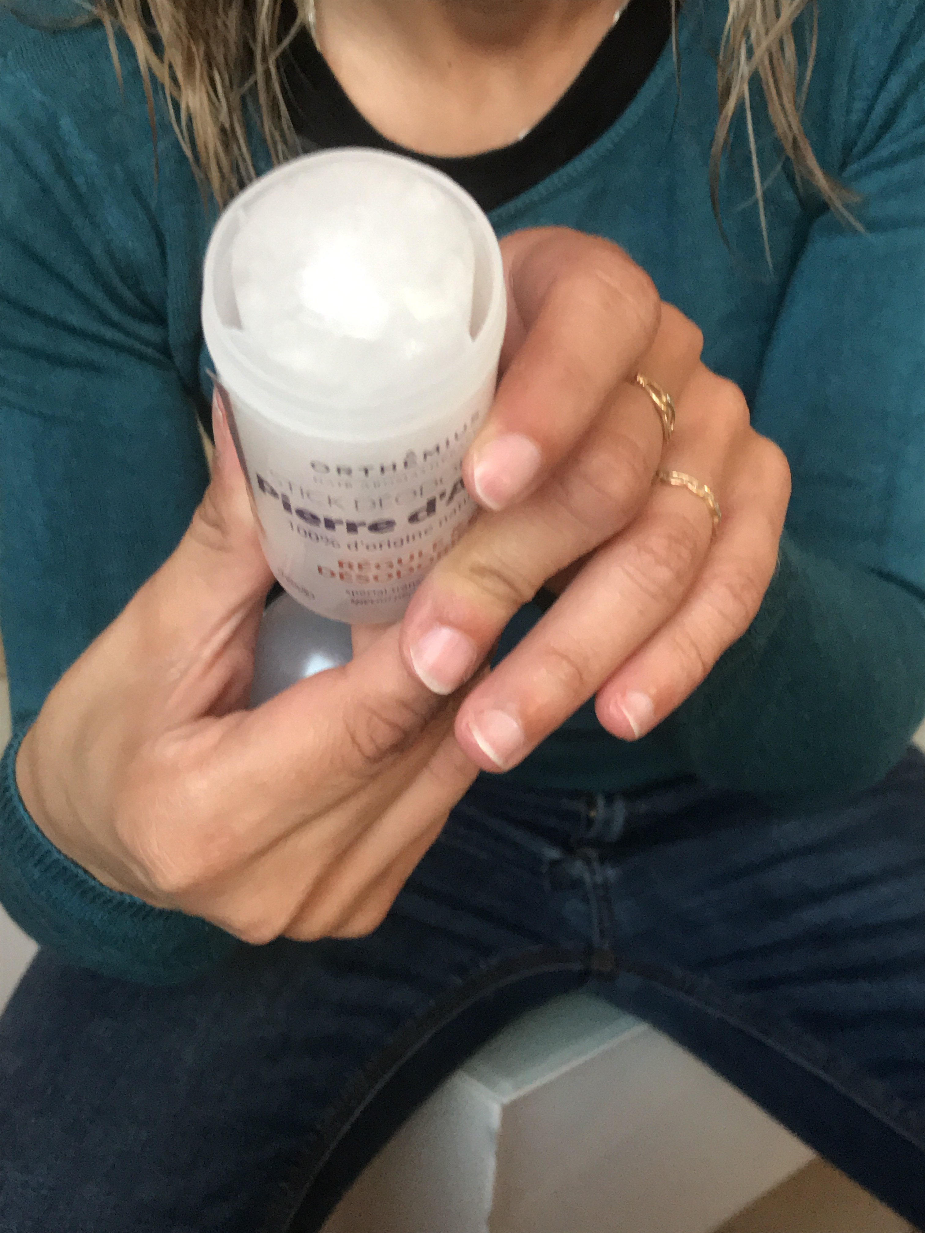 Mais au fait, l’alun c’est quoi? Il s’agit d’un sel à base de sulfate de potassium. La pierre d’Alun est utilisée depuis l’Antiquité dans de nombreuses applications, en particulier la teinturerie pour ses aptitudes à faire adhérer la teinture au tissu. Elle a été découverte en Occident à la Renaissance au moment où le navigateur Juan De La Costa l’a ramenée de Constantinople. C’est un excellent déodorant naturel qui régule la transpiration et élimine les mauvaises odeurs. Comme elle est totalement transparente, elle ne tâche pas. On peut l’utiliser aussi pour traiter les mains moites ou la transpiration des pieds. En plus, la roche d’Alun a un effet calmant et apaisant comme soin après rasage par exemple, elle calme l’irritation après l’épilation des jambes.