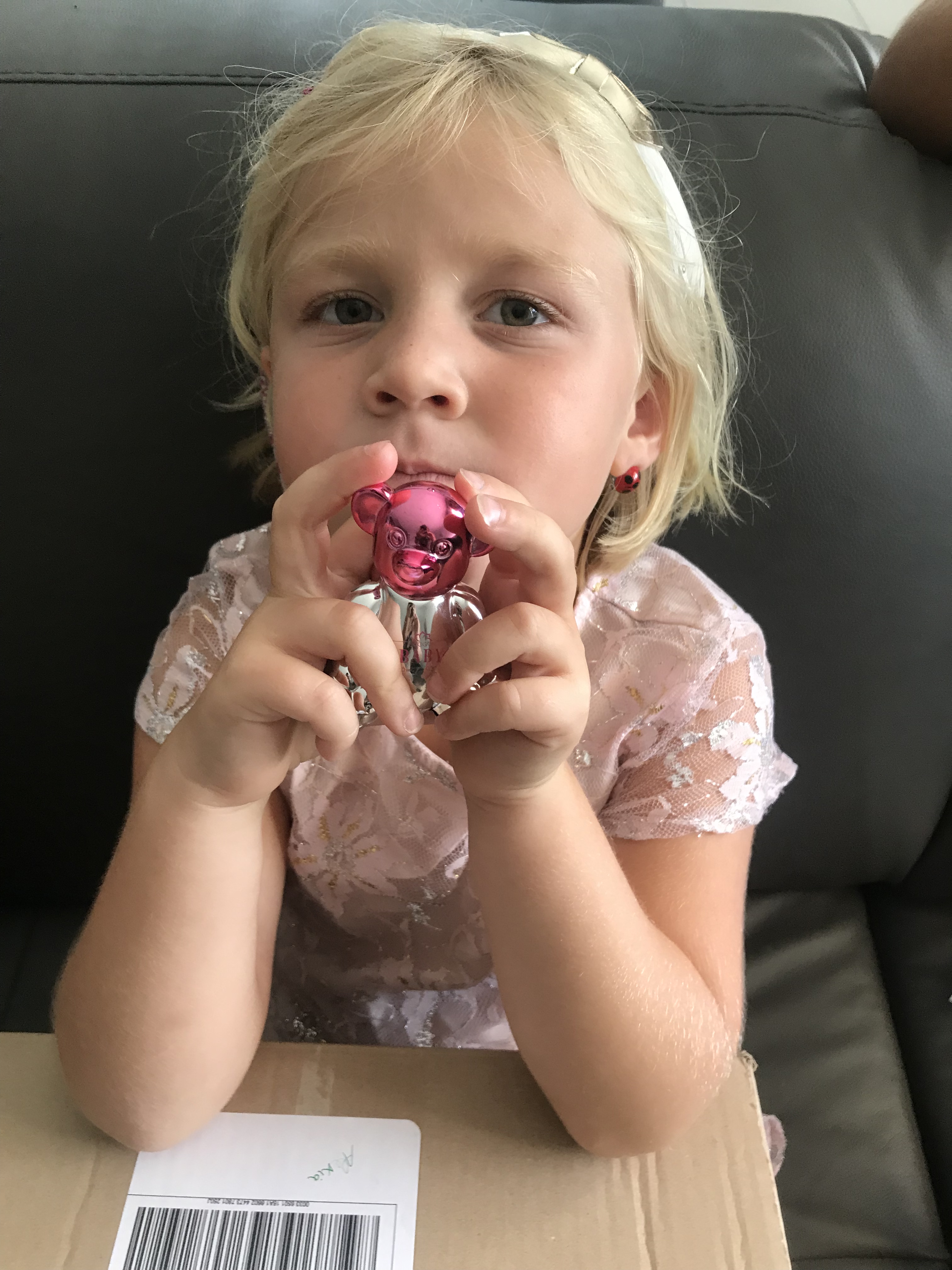 Je pense que vous devez vous en douter mais ce qui a immédiatement attiré les filles et leur a donné envie d’utiliser au plus vite leur parfum, c’est ce magnifique flacon nounours! Il faut dire que ce corps argenté et cette adorable tête rose (qui existe aussi en bleu pour le parfum pour les p’tits gars) sont juste sublimes! Ce sont quasiment des œuvres d’art et je sais déjà que même quand il sera vide, les filles voudront le conserver pour l’exposer dans leur chambre (reste à savoir laquelle des deux aura ce privilège!).