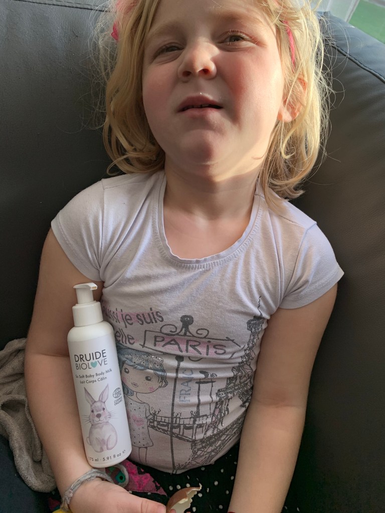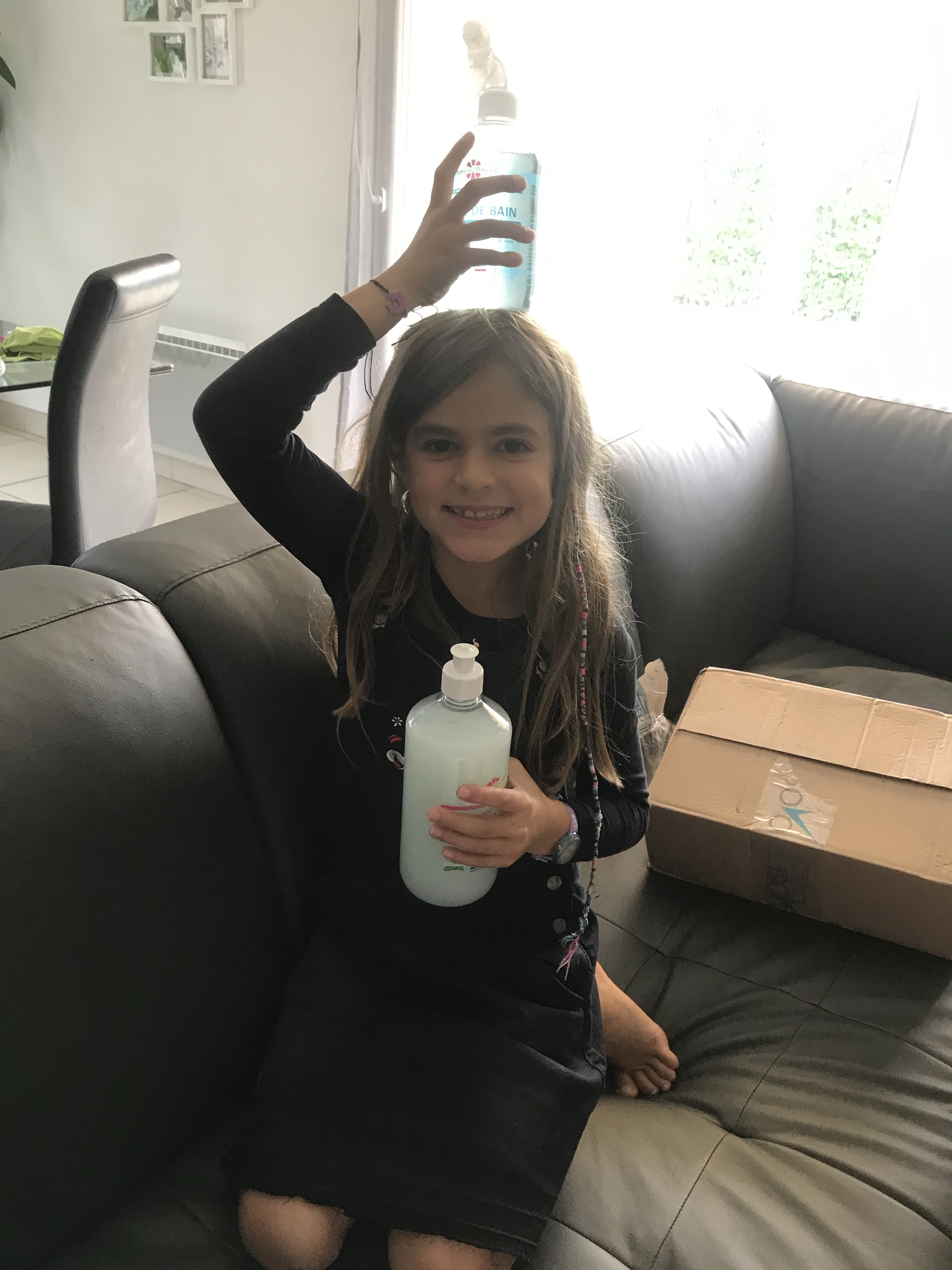 Tout ceci fait envie et est très prometteur, n’est-ce pas? Mais le résultat est-il à la hauteur?Et bien la réponse des trois loulous est unanime est OUI même s’il faut un peu nuancé selon les goûts de chacun… Pour Anaïs, le lait lui laisse la peau « trop douce » et surtout grâce à lui elle n’a plus de démangeaisons et la peau de son dos abîmée par l’eczéma est bien plus hydratée ce qui est un gros plus. Par contre, elle n’apprécie pas l’odeur et du coup, je dois négocier pour qu’elle accepte que je lui en mette la canaille alors que quand elle en a, elle me remercie finalement en me disant que ça lui fait vraiment du bien!