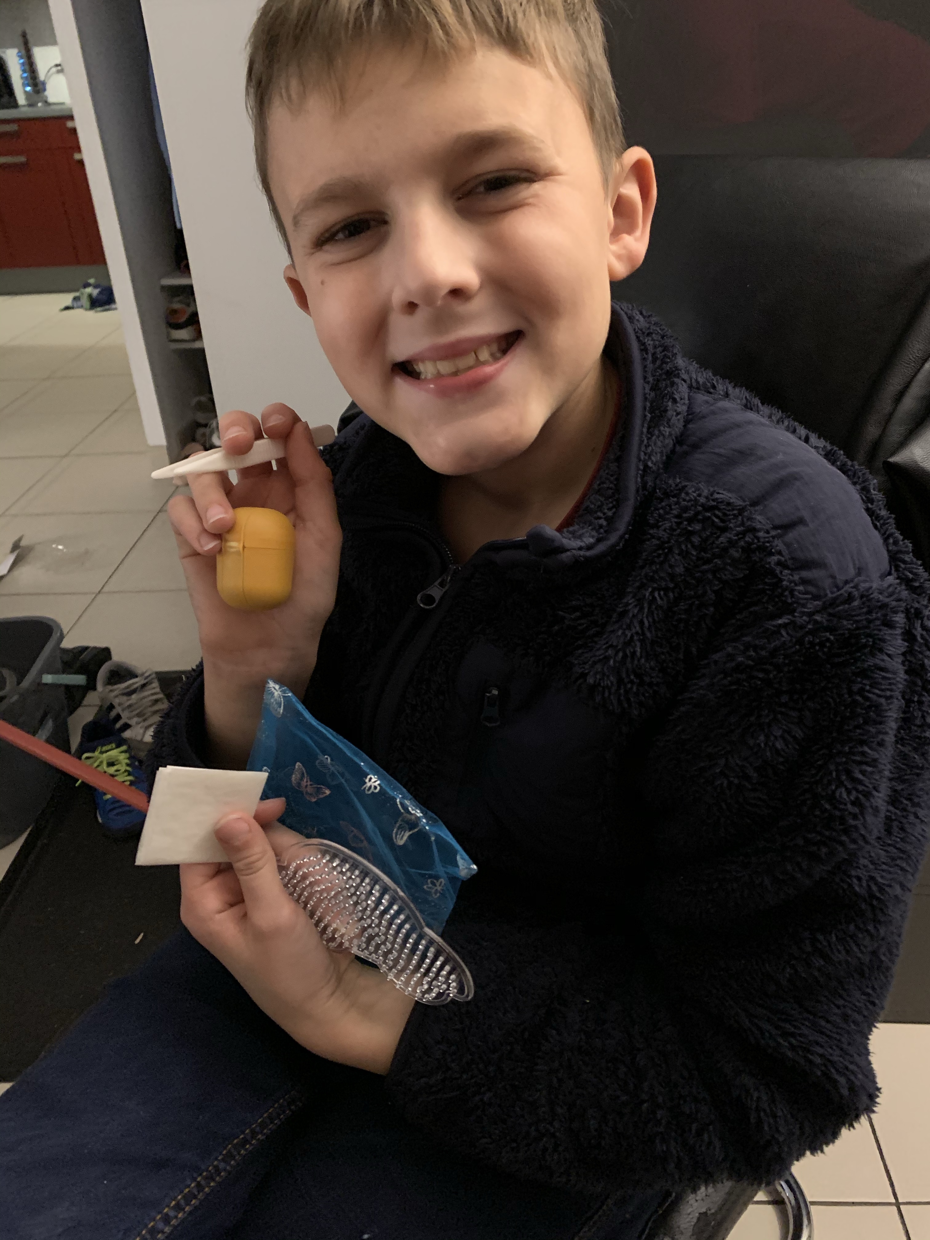 Passons à présent à Maël qui a aussi choisi difficilement les deux produits de la sélection qui lui plaisaient le plus. Pour commencer, il a craqué sur le bracelet peluche renne parce qu’il le trouve super doux et adorable (il existe aussi en version renard et panda). Depuis, il l’a accroché au bord de son lit et il veille donc sur son sommeil! Et en prime, comme pour le petit ours d’Anaïs il est accompagné de son sachet de 75g de délicieuses bouchées en chocolat aux céréales.
