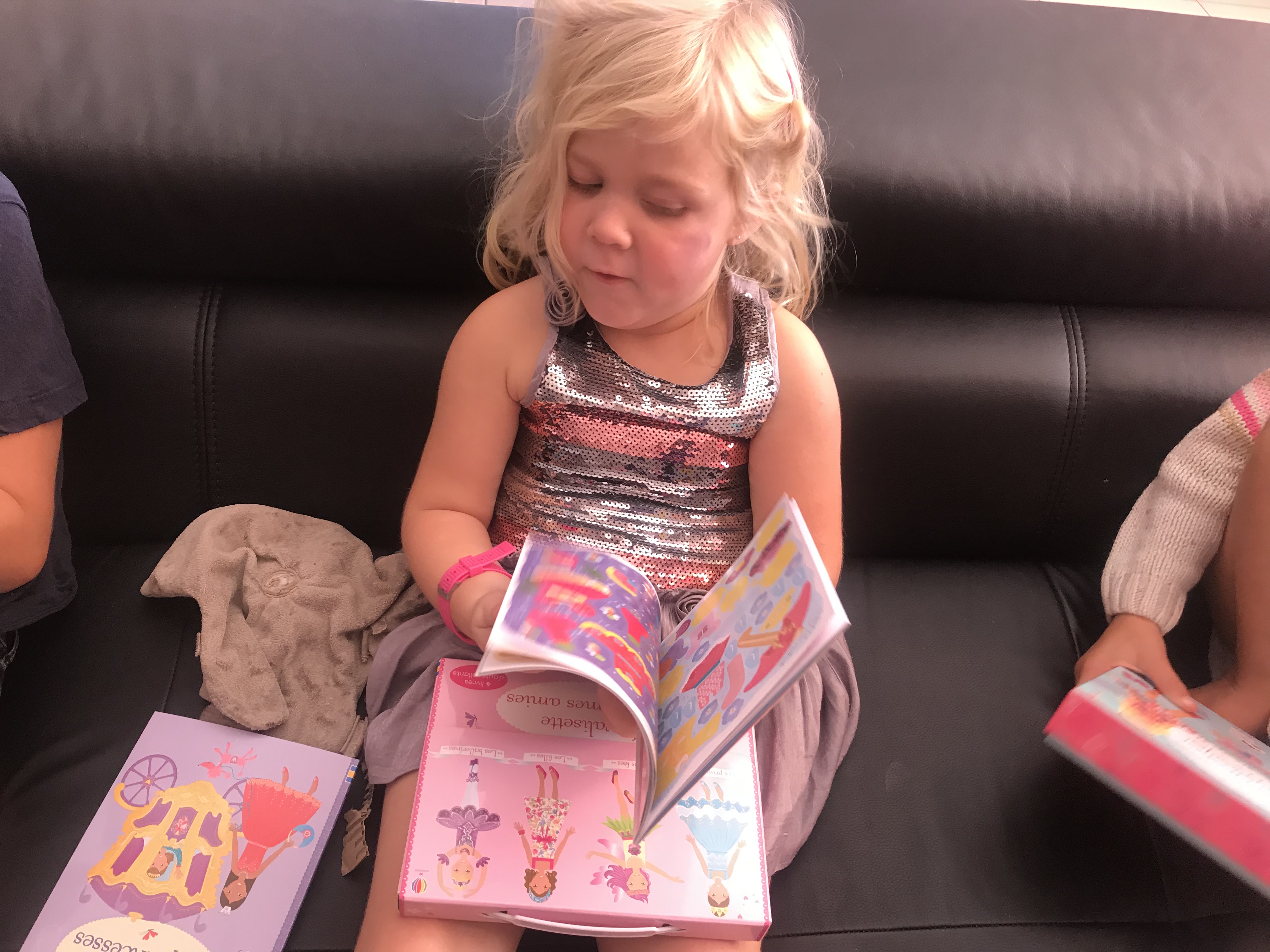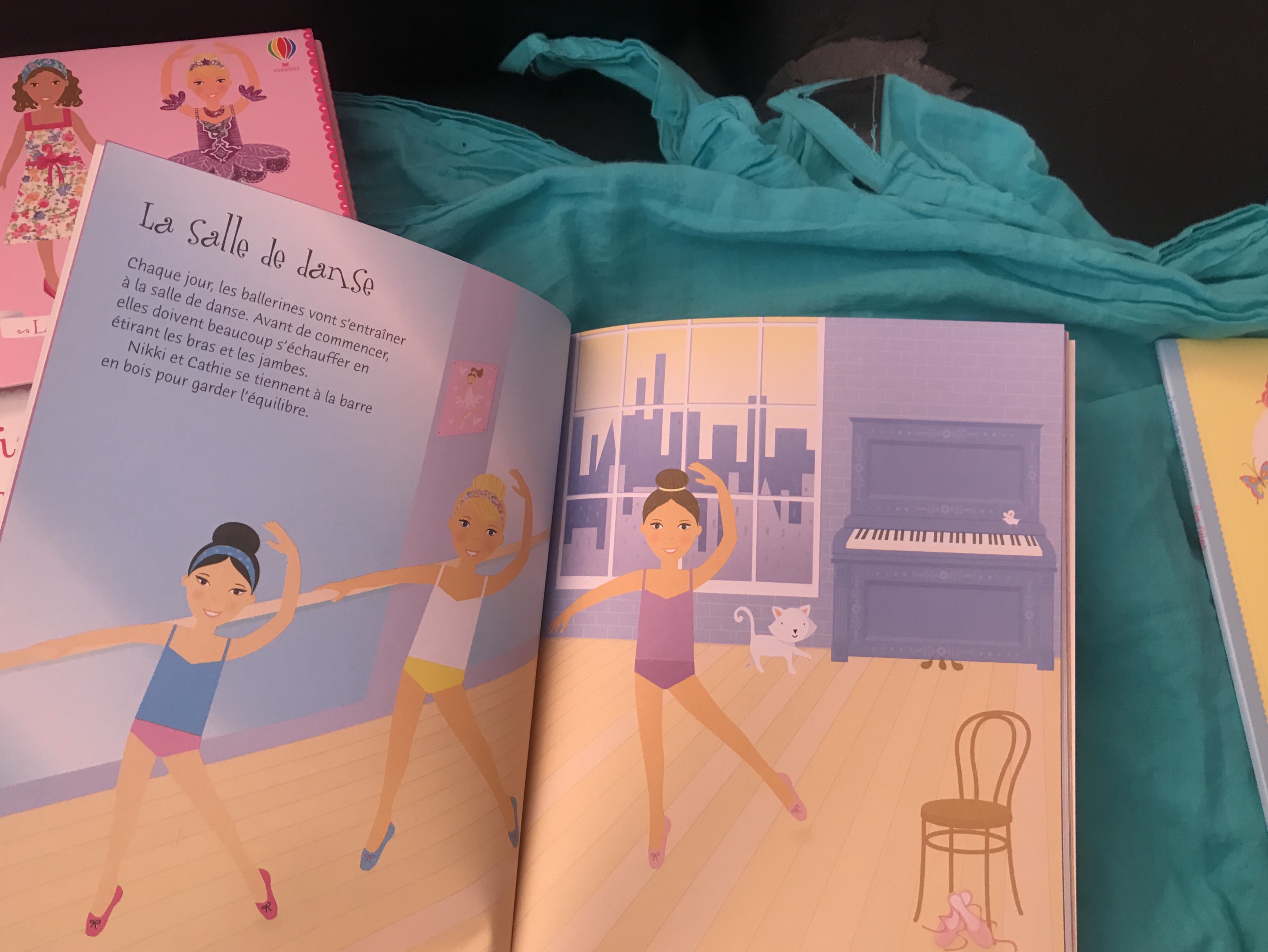 Comme vous pouvez le voir au fil des photos, chaque petit livre comprend un grand nombre d’autocollants à replacer pour habiller les personnages (pour le plus grand bonheur de ma princesse!)dans des scènes en rapport avec le thème de chacun d’eux. Pour celui-ci vous aurez bien entendu reconnu les ballerines. Ma louloute admire les danseuses depuis qu’elle a essayé le tutu de sa cousine alors forcément elle est conquise!