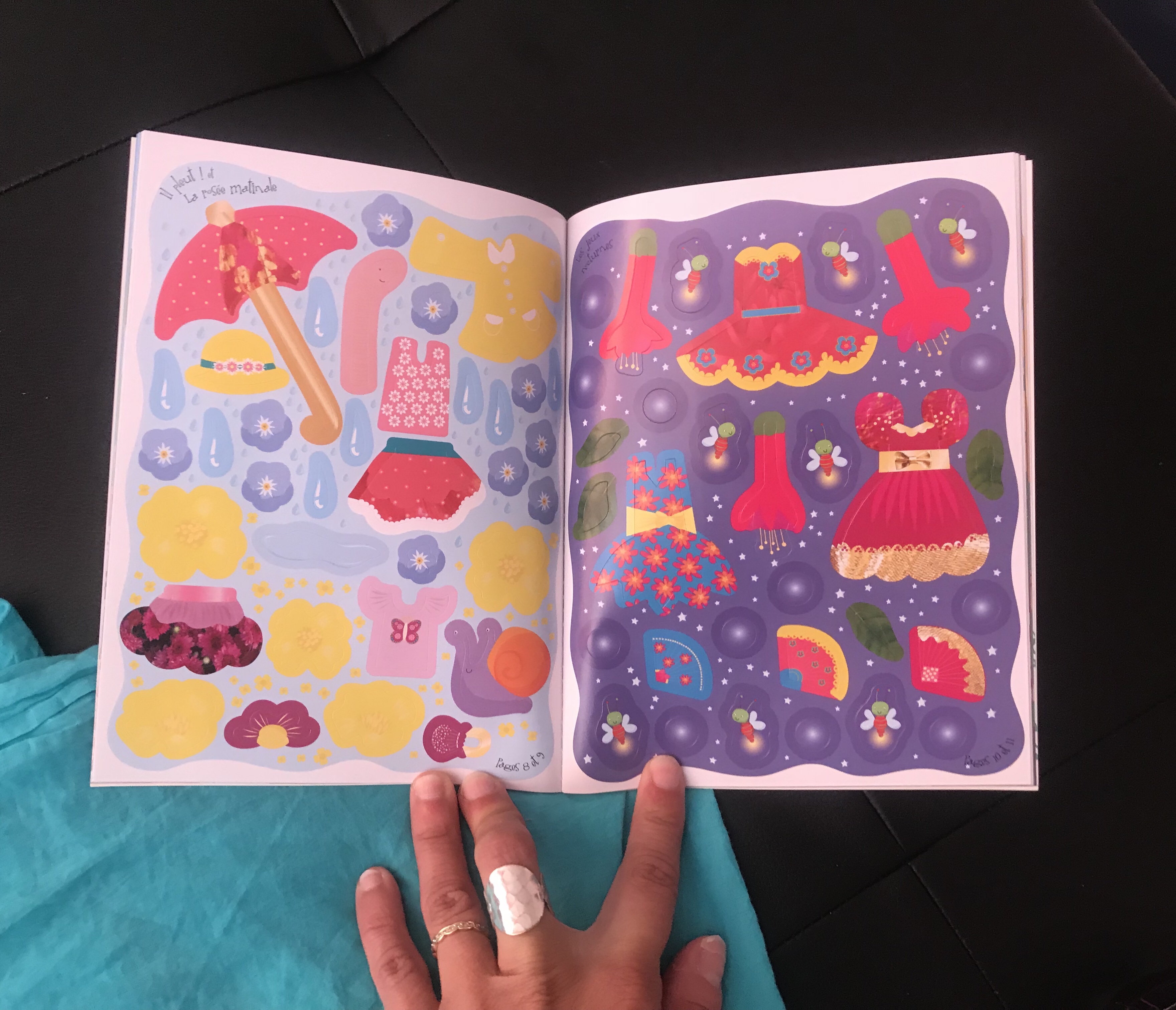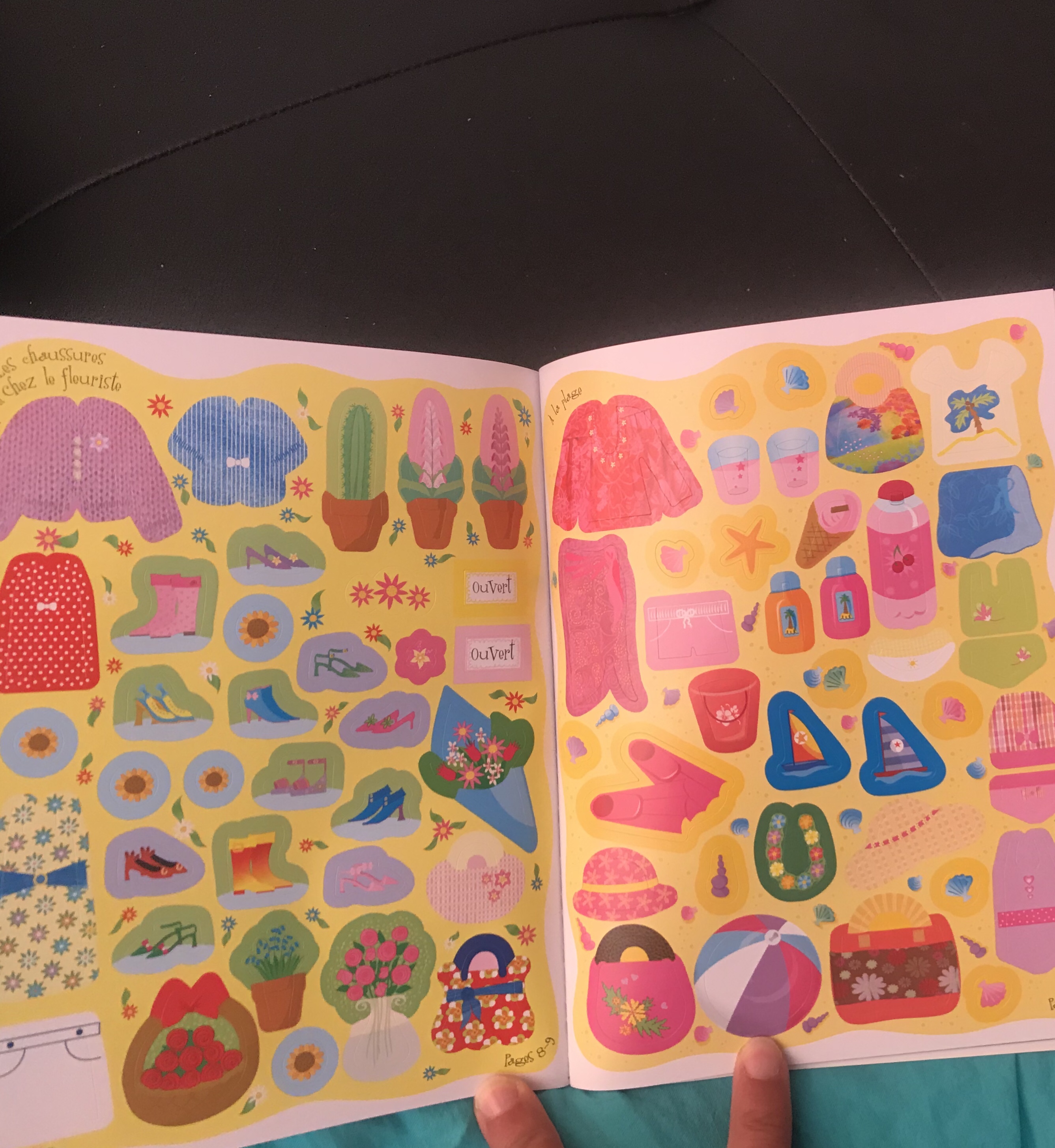 Vous pouvez observer ici un thème du second livre de la valisette, les amies autour d’un bon petit pique-nique. Là encore les décors sont simples mais colorés et plein de vie, ils donnent vraiment envie de feuilleter le livre et d’y ajouter sa touche personnelle grâce aux autocollants.