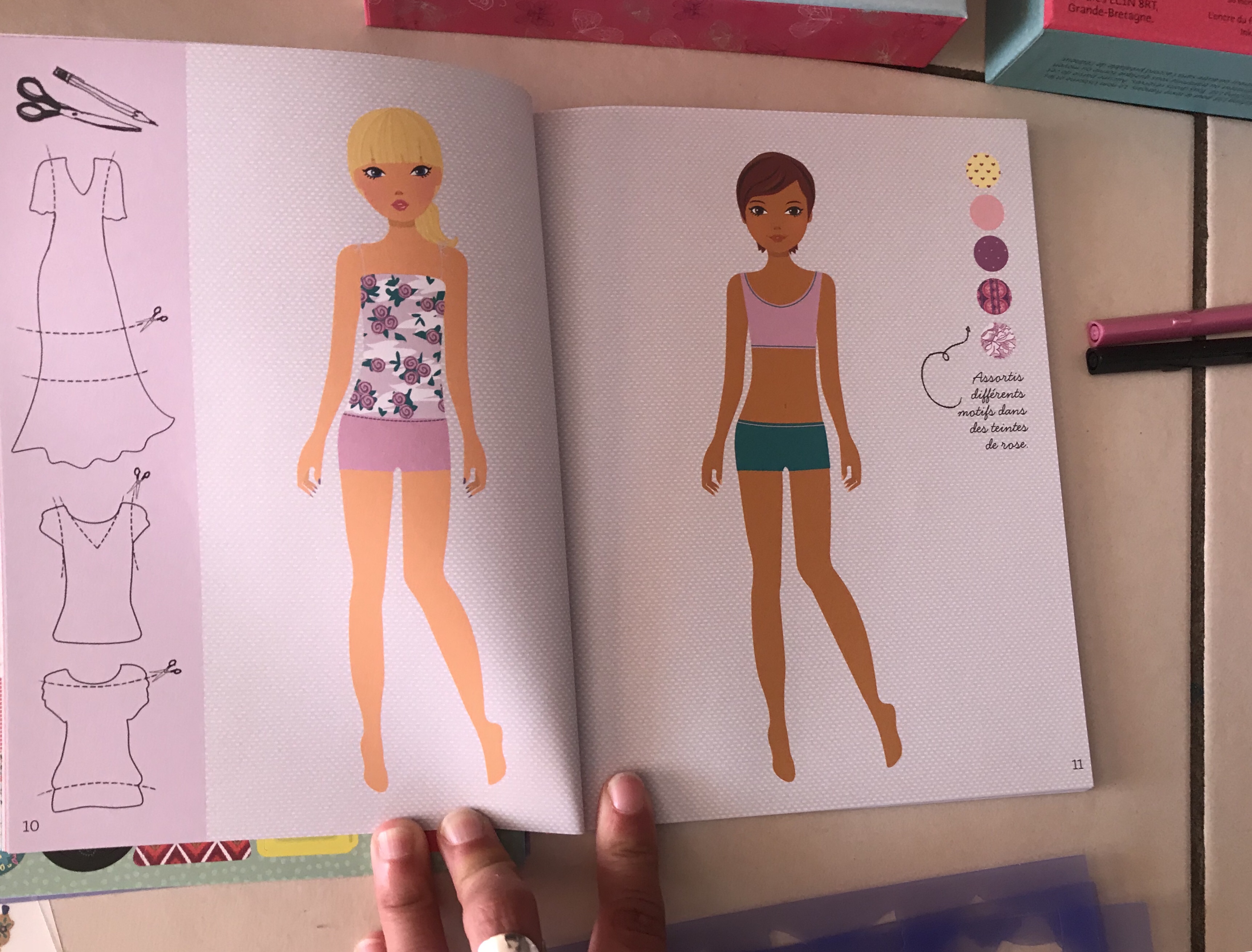 Ce coffret a été créé par Fiona Watt( pour les nombreux conseils que l’on peut trouver au fil des pages pour savoir comment créer une collection) et illustré par Stella Baggott et Antonia Miller. Et il est vraiment bien fait et très complet. La preuve, Camille l’a depuis plusieurs mois maintenant et n’a pas encore terminé! Il faut dire qu’elle crée ses modèles avec beaucoup de soin et d’application. Elle peut y passer des heures pour arriver au résultat qu’elle souhaite. J’apprécie beaucoup ce genre d’activités qui permettent aux enfants de développer leur créativité et leur souci du travail bien fait.