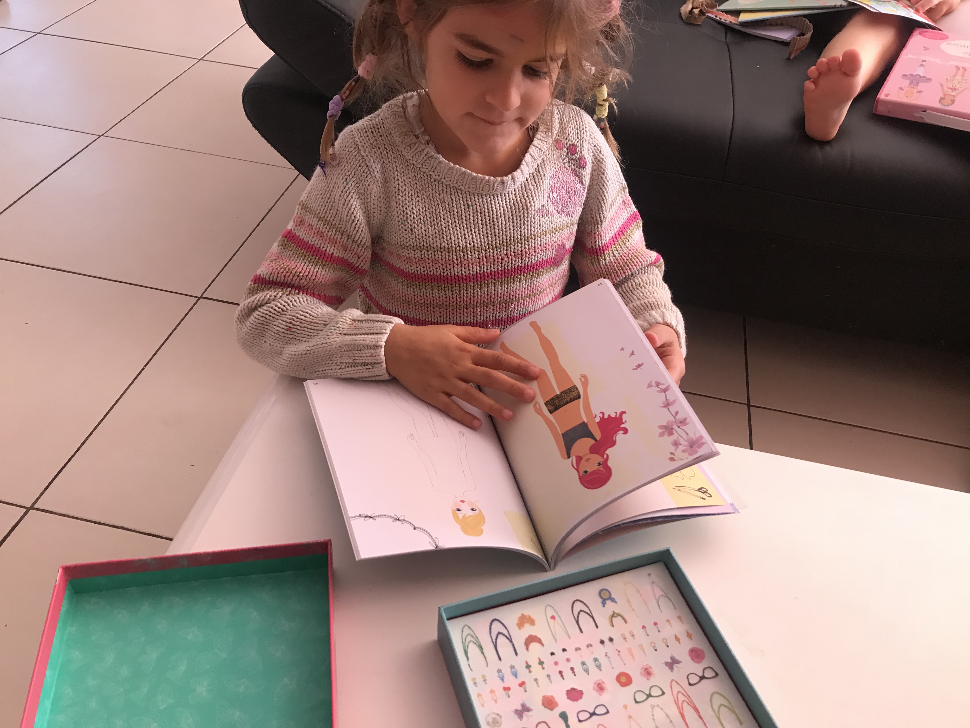 Une des choses qu’elle apprécie le plus et qu’elle a découvert grâce à ce coffret ce sont les décalcomanies. Et je la comprends, j’adorais ça quand j’étais petite! Une fois que je lui ai expliqué le fonctionnement elle s’est mis au travail avec un plaisir non dissimulé et elle a ensuite appris avec beaucoup de fierté à sa sœur comment faire! Ça a un côté magique ces images qui se collent sur notre support quand on les colorie!