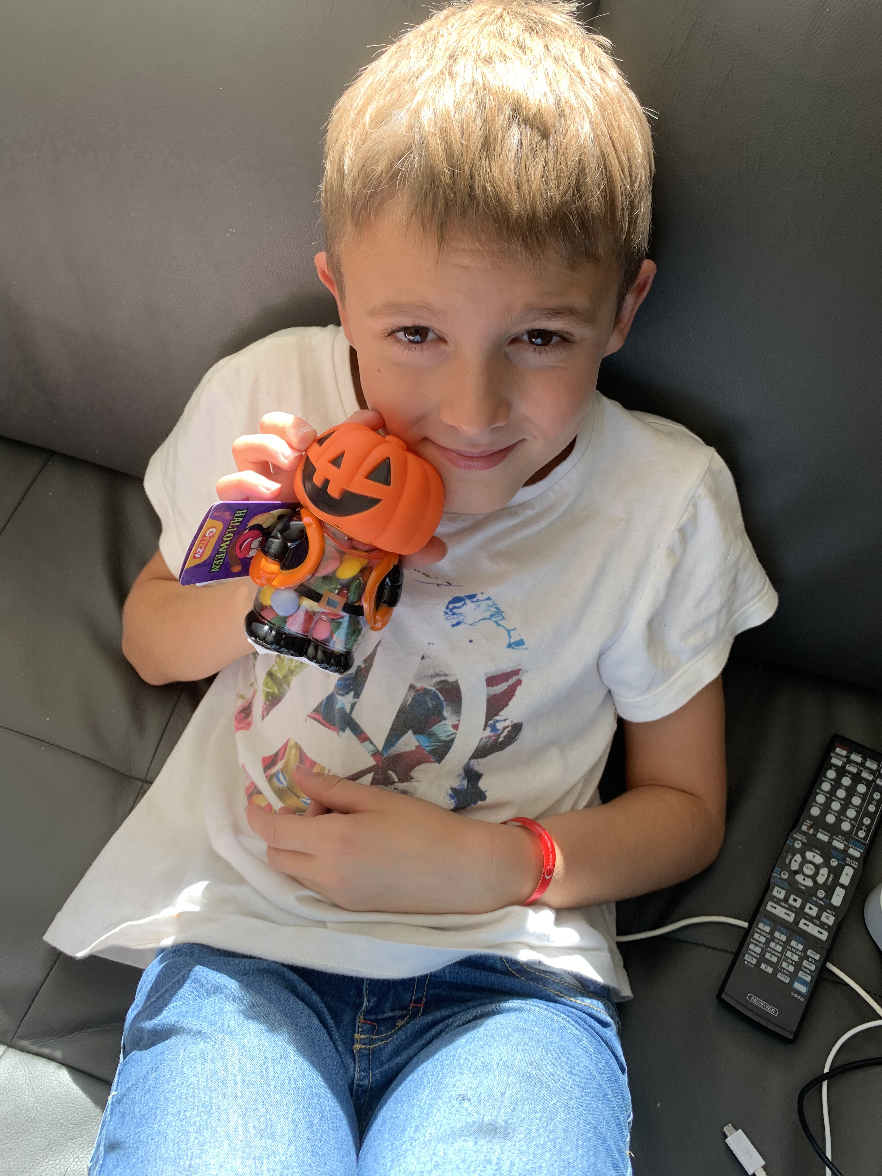 Passons maintenant à la découverte des quatre produits contenus dans le colis avec un des préférés d’Anaïs: la tirelire citrouille d’Halloween remplie de pastilles de couleurs chocolatées! Elle qui n’aime pas les bonbons était juste aux anges de découvrir du chocolat dans le colis! Son frère et sa sœur ont dû jouer des coudes pour en goûter aussi! Par contre, ils n’ont pas réussi à pouvoir récupérer la tirelire une fois vidée de ses friandises… Elle trône désormais sur l’étagère de la chambre de ma canaille préférée!