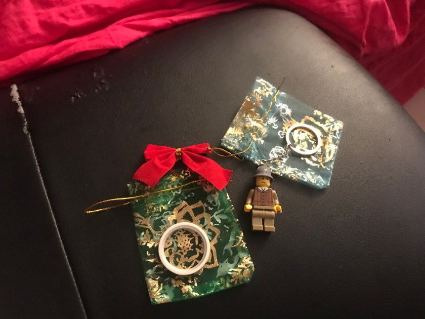 On passé à Maelou qui a décidé de vous montrer les deux d’un coup: du masking tape et un petit noeud pour décorer le sapin et une figurine lego qui va pouvoir venir agrandir sa collection pour son plus grand bonheur .