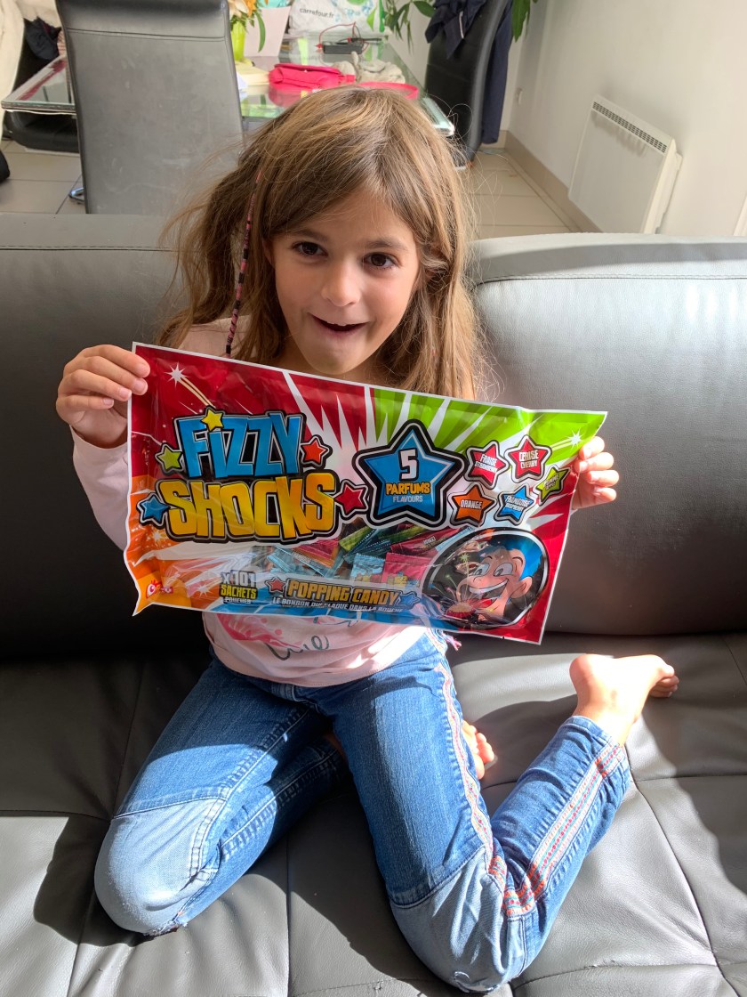 Sitôt reçu, sitôt essayé et approuvé par les enfants qui adorent ce côté pétillant! Et ça a réveillé plein de souvenirs en moi! En effet, quand j’avais leur âge, j’adorais ce genre de bonbons et je me souviens des fou-rire que l’on partageait avec les copains en les mettant sur nos langues et en les tirant pour les entendre pétillant, exactement comme Camille sur la photo! J’adore ces moments où je me rends compte que malgré les années, beaucoup de choses demeurent malgré tout dans les cours de récréation. Et ça fait du bien dans notre monde où tout va toujours trop vite.