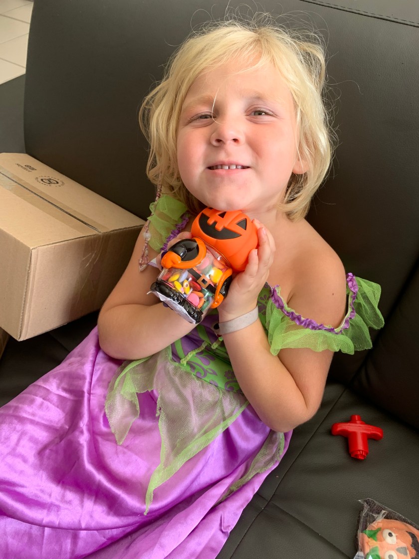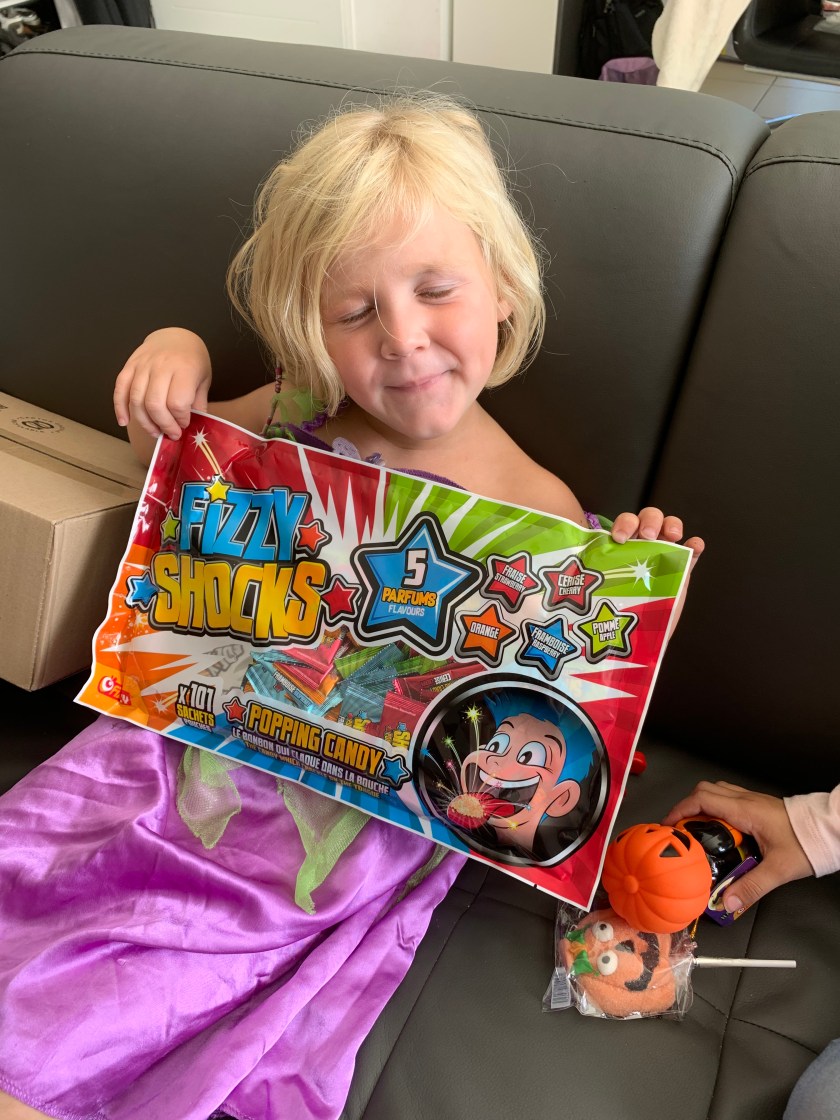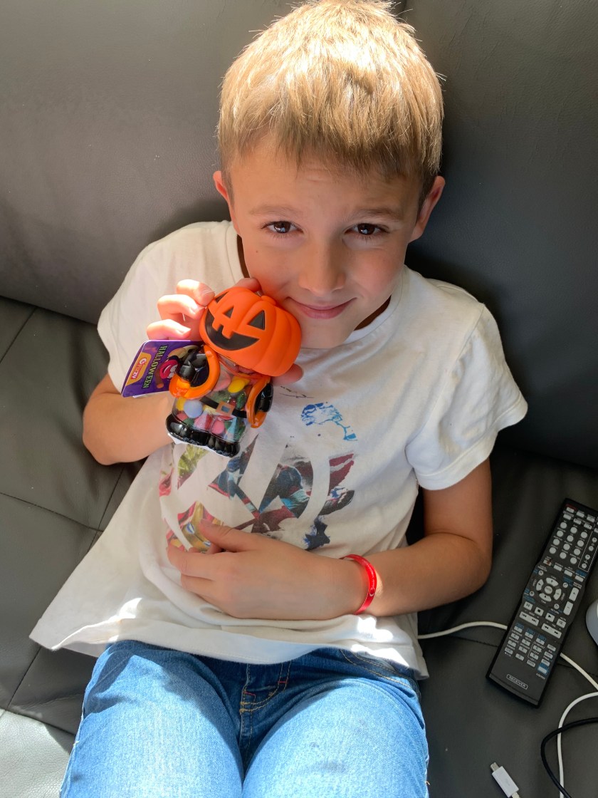 Passons maintenant à la découverte des quatre produits contenus dans le colis avec un des préférés d’Anaïs: la tirelire citrouille d’Halloween remplie de pastilles de couleurs chocolatées! Elle qui n’aime pas les bonbons était juste aux anges de découvrir du chocolat dans le colis! Son frère et sa sœur ont dû jouer des coudes pour en goûter aussi! Par contre, ils n’ont pas réussi à pouvoir récupérer la tirelire une fois vidée de ses friandises… Elle trône désormais sur l’étagère de la chambre de ma canaille préférée!