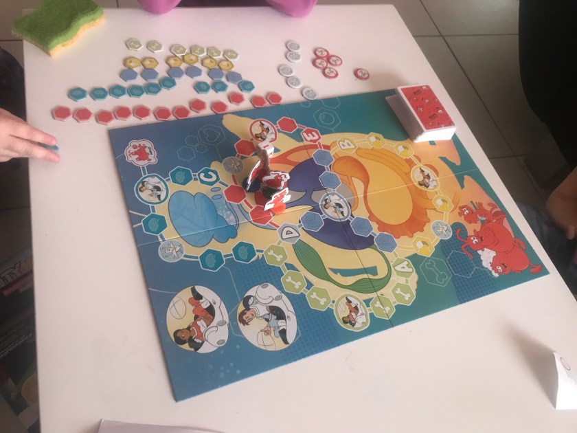 Si nous n’avons pas la carte pour combattre le virus qui nous attaque, nous devons le poser sur une case vitamine qui empêche alors le passage dans les deux sens. Il vaut donc mieux les combattre si on ne veut pas bloquer le jeu! Quand un des joueurs a collecté un jeton de chacun des 5 systèmes, il doit se rendre à la case arrivée à côté du cerveau et répondre correctement à une question sur chacun des systèmes (en une ou plusieurs fois selon la confiance qu’il a en lui)! Et je vous garantis que c’est loin d’être facile de faire un sans faute alors il vaut mieux être prudent! Rien n’est gagné tant que la dernière bonne réponse n’a pas été donnée, tout peut basculer!