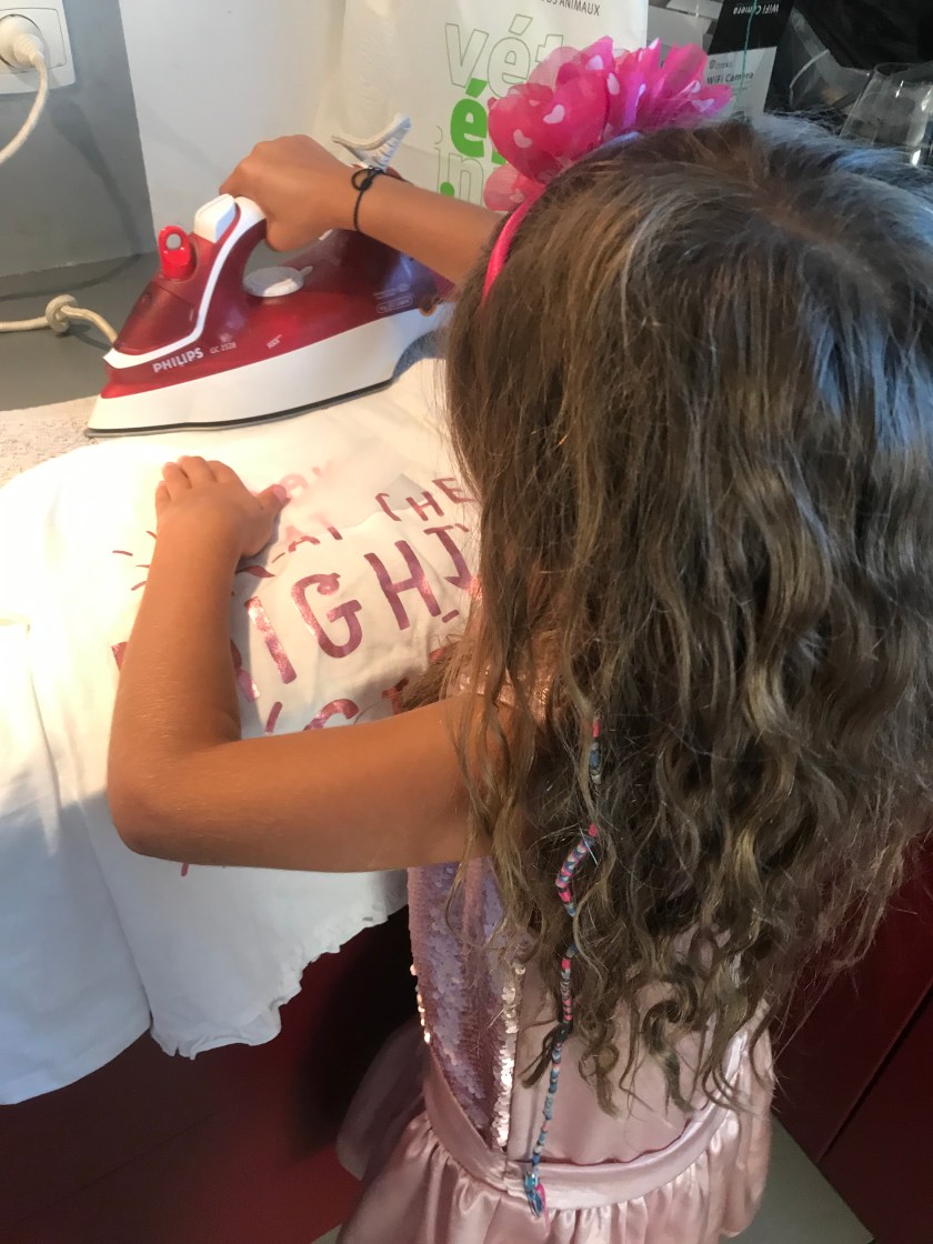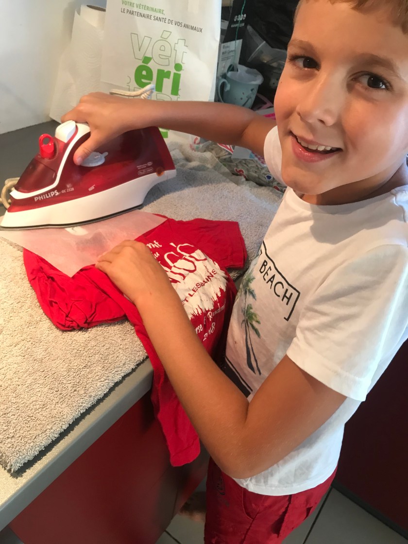 Ça va faciliter la vie des ATSEMS, des maîtresses et des animateurs de l’école qui n’auront plus à chercher à qui appartiennent les vêtements égarés! Une nouvelle fois les enfants ont voulu tout faire seuls (sauf Anaïs qui est encore trop petite pour utiliser le fer) mais sous haute surveillance car une brûlure est vite arrivée!