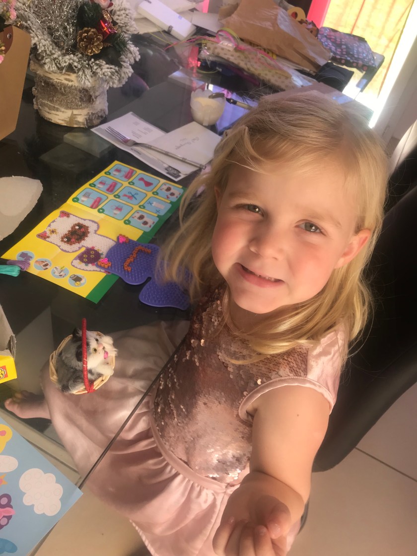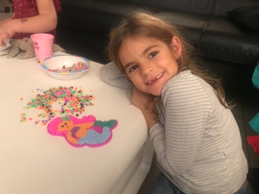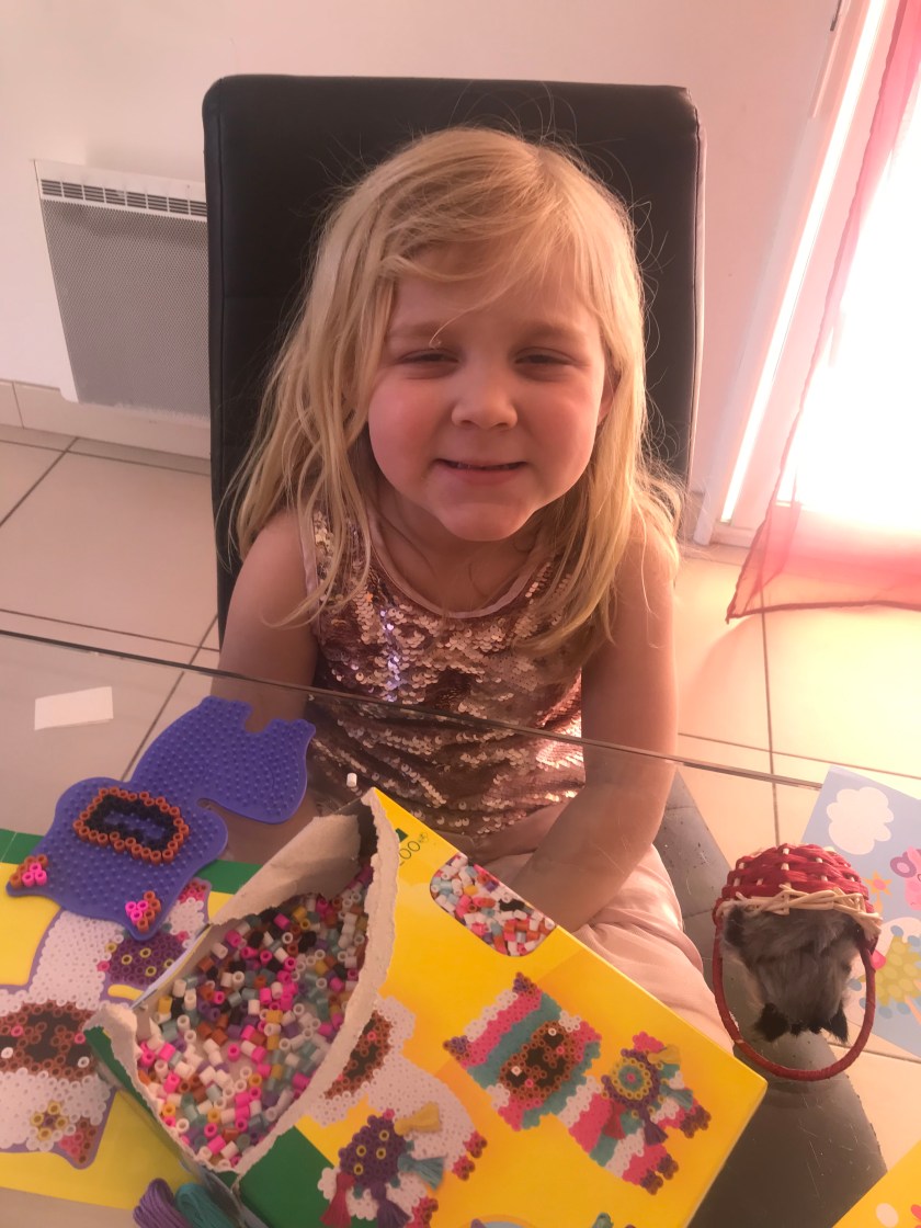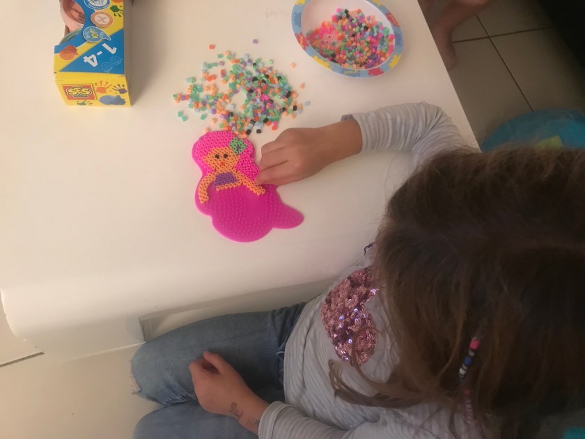 Même si elle n’est pas encore parvenue au bout, Anaïs réalise cet activité avec beaucoup de plaisir et une concentration extrême, ce qui peut paraître étonnant pour ceux qui la connaissent et la voient sauter partout du matin au soir! Mais quand quelque chose l’intéresse vraiment elle peut rester en place et être très appliquée car elle a le goût du travail bien fait. C’est une des grosses qualités des perles à repasser, aider les enfants à travailler leur motricité fine et donc à canaliser leur énergie pour maîtriser leurs gestes.