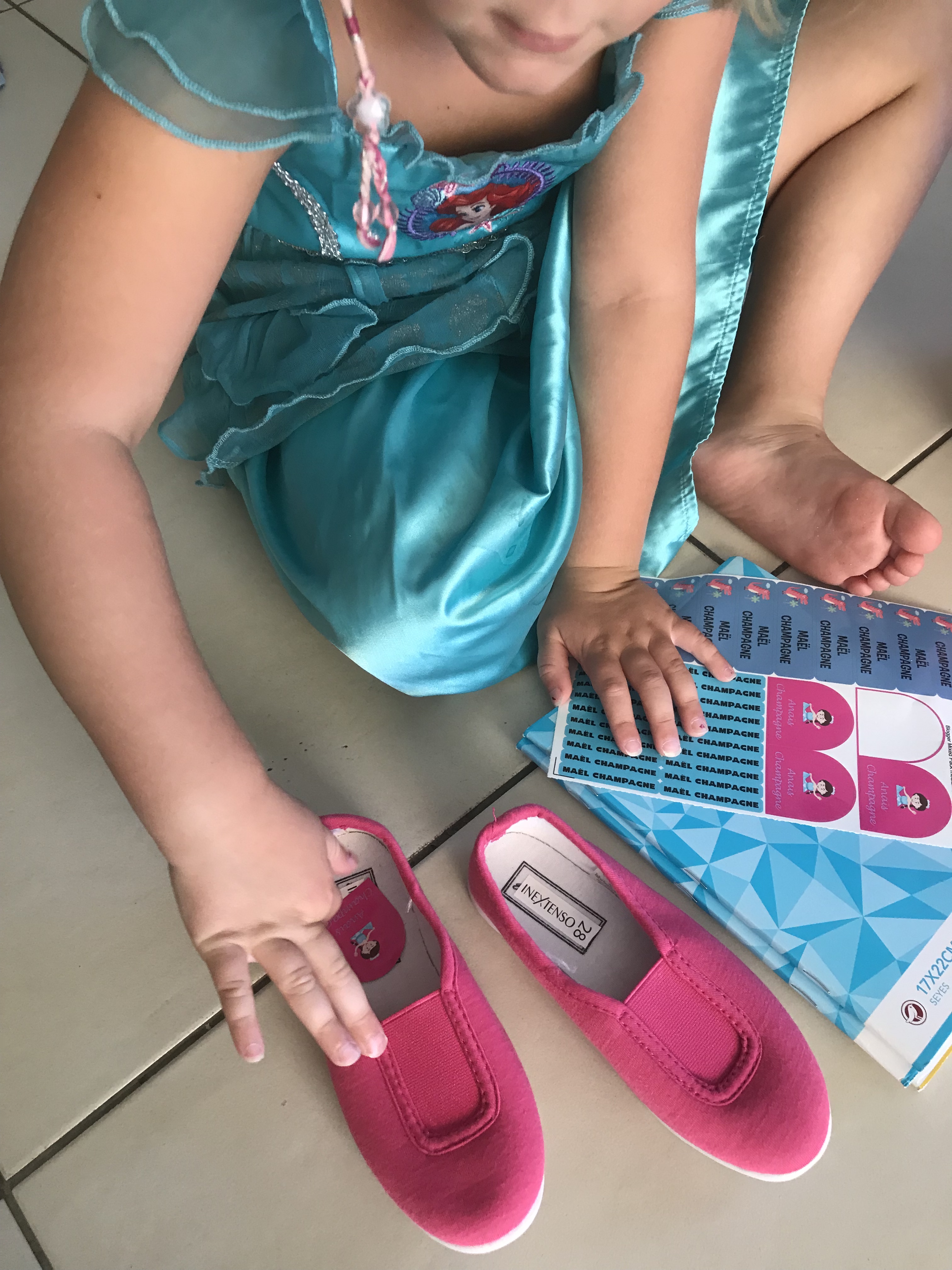 En tout cas, que ce soit les enfants ou moi, nous sommes très satisfaits du résultat: les étiquettes sont très jolies, les couleurs vives et attrayantes et surtout elles sont faciles à coller, décoller, recoller pour les positionner correctement. Les loulous ont donc pu se débrouiller seuls pour étiqueter leurs fournitures (pour Maël) et chaussures (pour Anaïs). Et ca c’est à la fois valorisant pour eux et très appréciable pour la maman que je suis qui a juste à superviser tout en préparant le repas: un vrai gain de temps.
