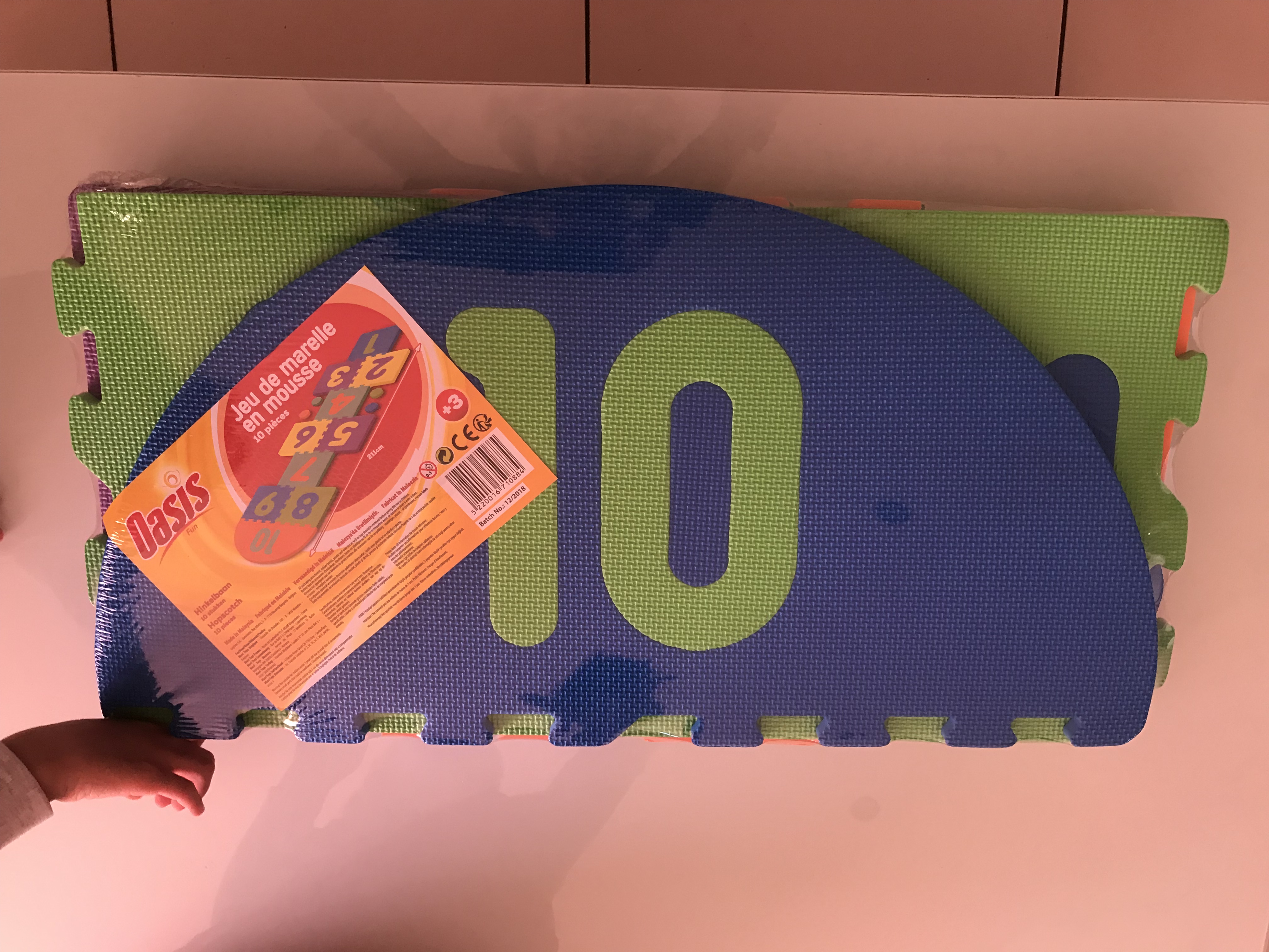 Cette marelle est proposée par la marque Oasis et elle est idéale pour jouer à l’intérieur. Oui parce que je sais pas vous mais moi quand j’étais petite, je me souviens avoir dessiné des centaines de marelles à la craie devant la maison de mes parents! Mais chez nous, il n’y a que du gazon dehors alors c’est bien pratique d’avoir une autre alternative avec ces 10 dalles en mousse! D’autant plus qu’on peut aussi les utiliser dehors quand il fait beau pour s’amuser sans abîmer la belle pelouse de papa, lol.
